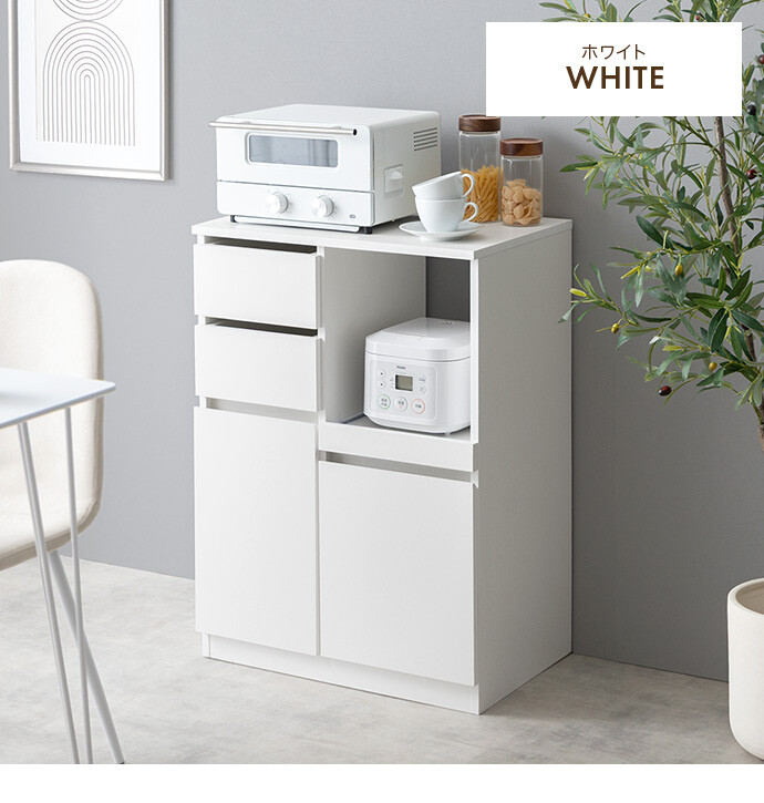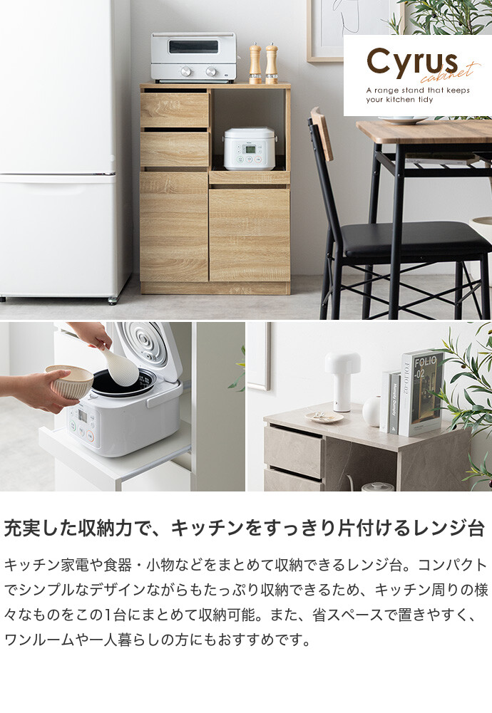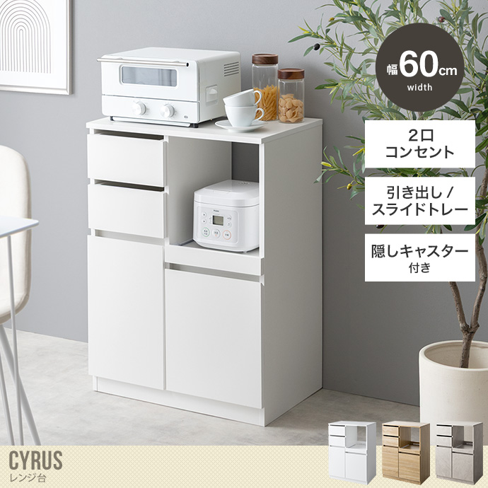 【送料無料】Cyrus サイラス 幅60 レンジ台 レンジボード レンジラック 食器棚 キッチンカウンター キッチンラック キャスター付き 60幅 キッチン収納 おしゃれ おすすめ 安い スライドトレー コンセント付き 引き出し 扉付き 扉収納 ホワイト