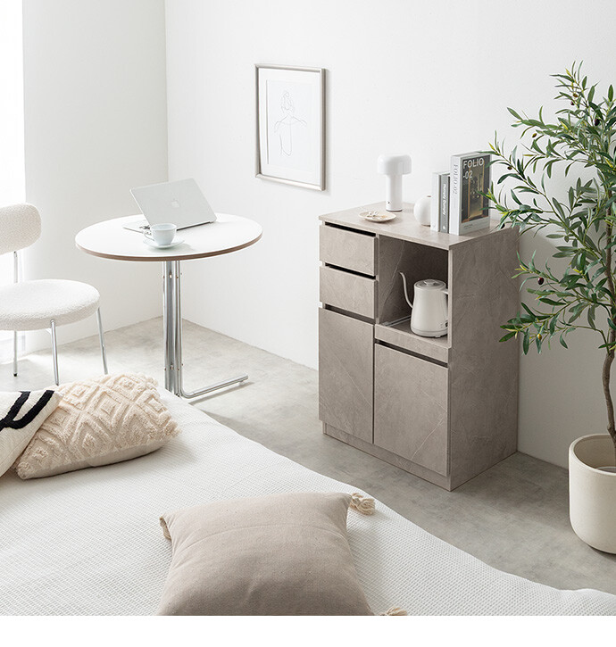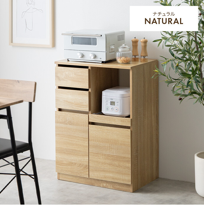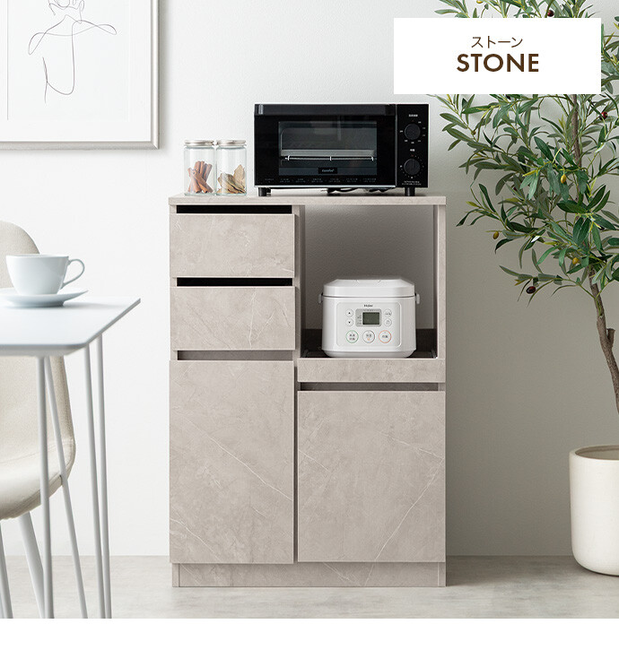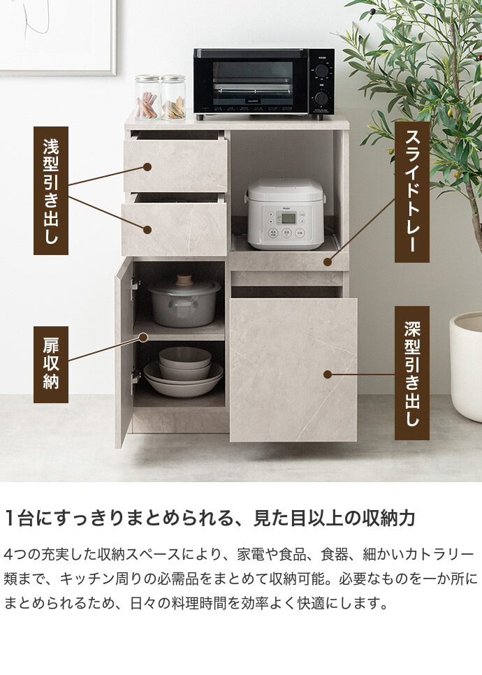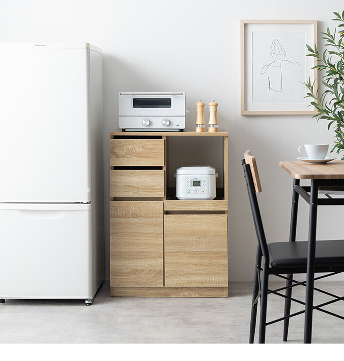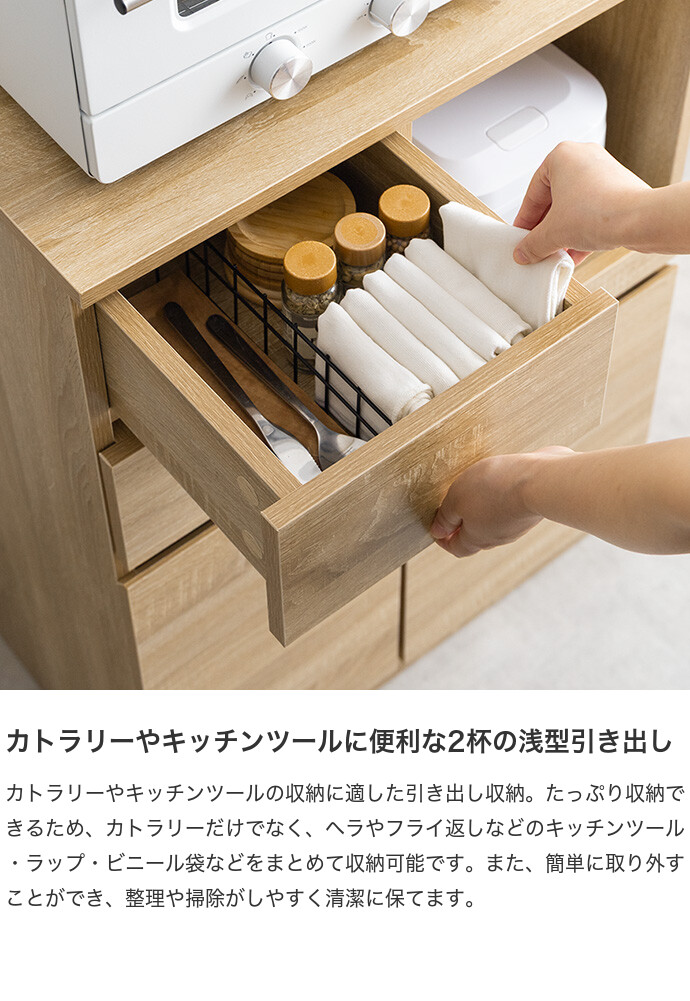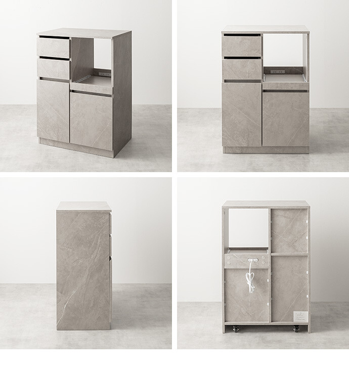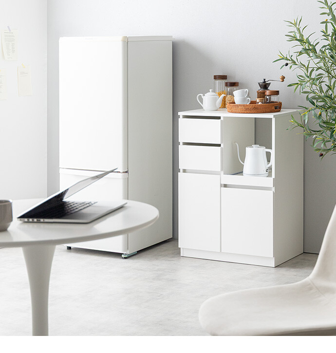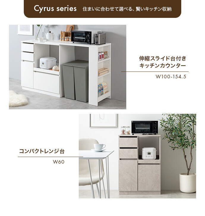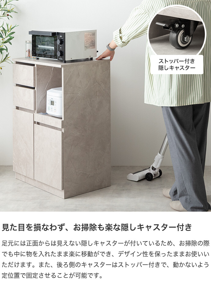 充実した収納力で、キッチン家電や食器・小物などをまとめて収納できる『Cyrus(サイラス)』レンジ台。コンパクトでシンプルなデザインながらもたっぷり収納できるため、キッチン周りの様々なものをこの1台にまとめて収納可能。また、足元には正面から見えず、デザインを損なわない隠しキャスター付きで、お掃除の際でも中に物を入れたまま楽に移動することも。どこにでも置きやすいコンパクトでスリムなサイズ感は、一人暮らしやワンルームの方にもおすすめです。