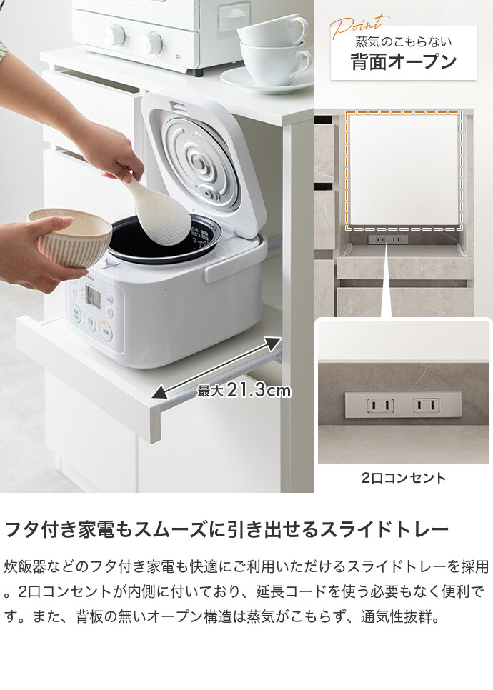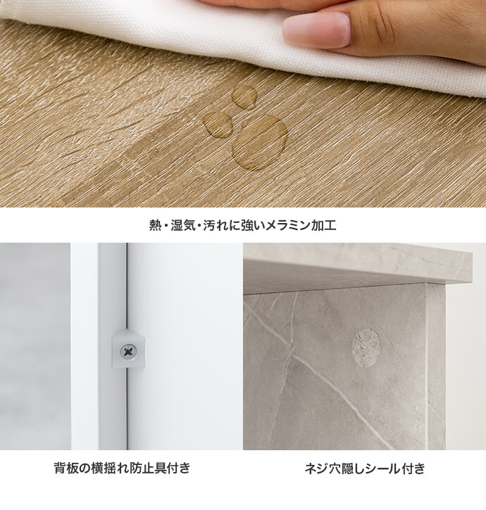 【耐荷重】天板:約20kg 、引き出し:(各)約5kg、スライドトレー:約5kg、可動棚:約5kg、扉収納内底板:約10kg