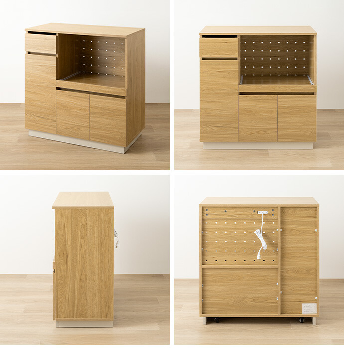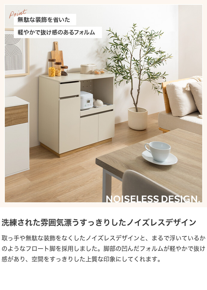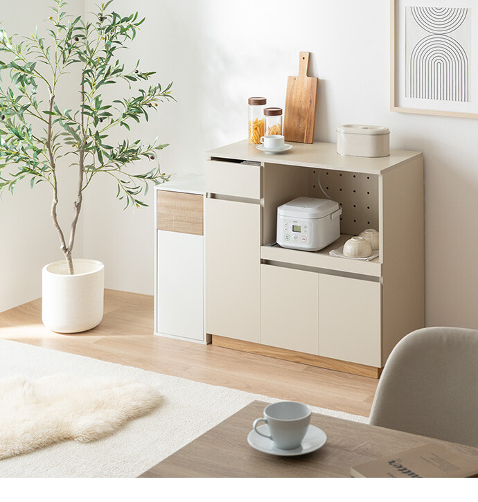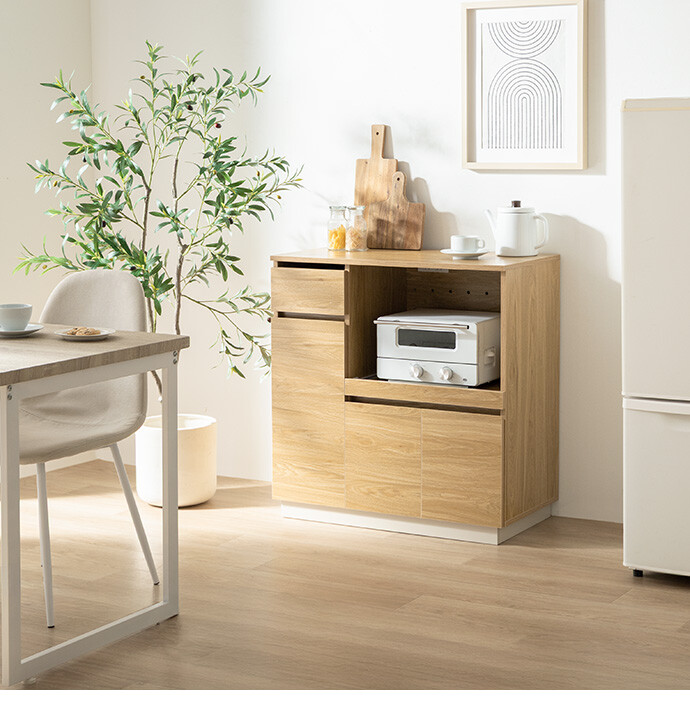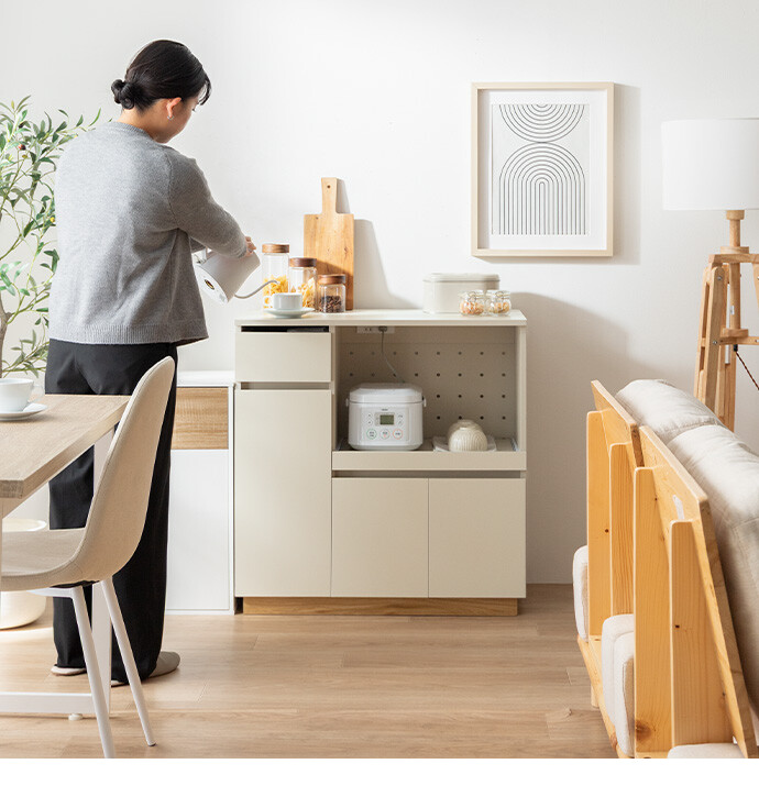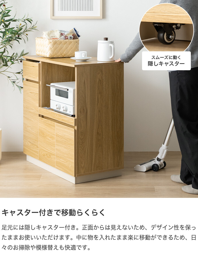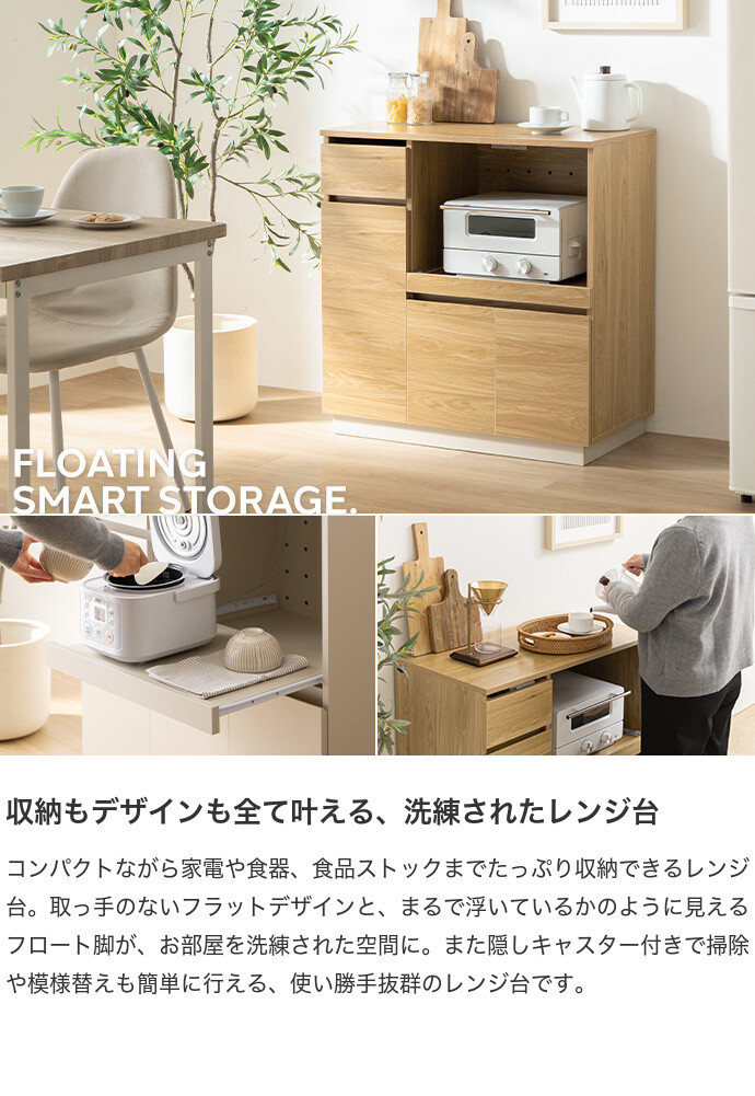 バイカラーの配色と抜け感のあるフロート脚が目を惹く、洗練されたデザインのレンジ台。置くだけで空間をすっきりと見せつつ、キッチンに上品なアクセントを添えてくれます。シンプルな見た目ながら収納力はしっかり備えており、家電や食器・小物などのキッチン用品をまとめて収納が可能。さらに足元には隠しキャスター付きで、掃除や模様替えも簡単に行える、使い勝手抜群のレンジ台です。