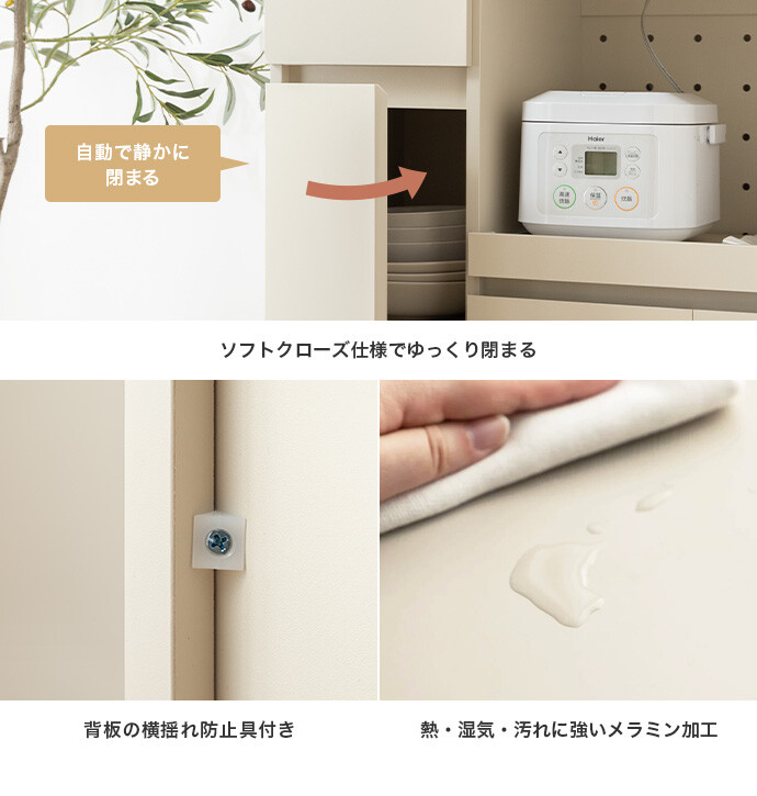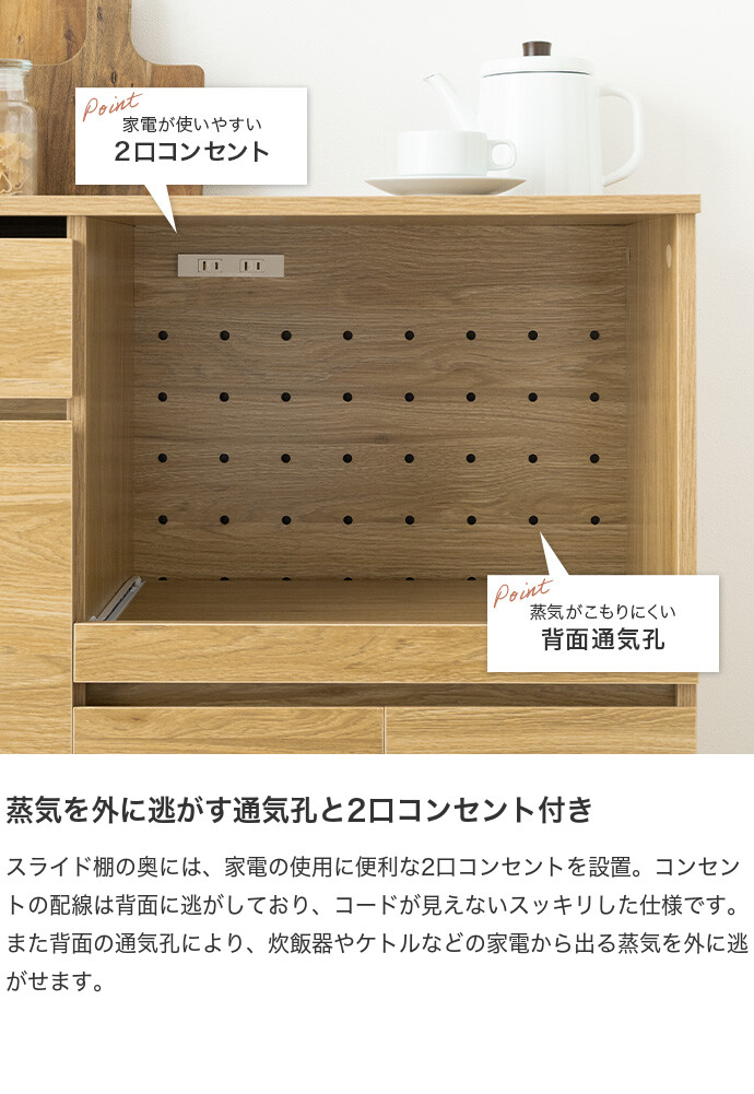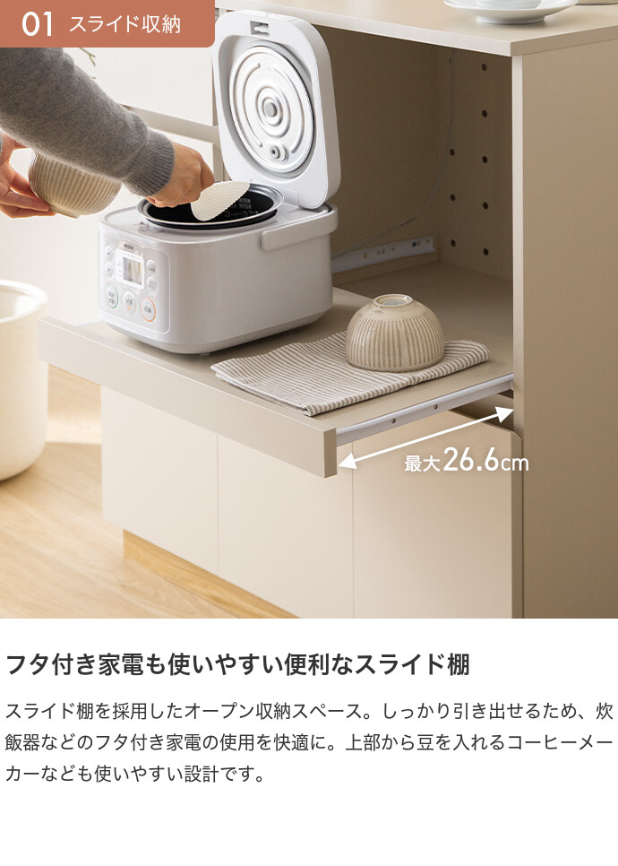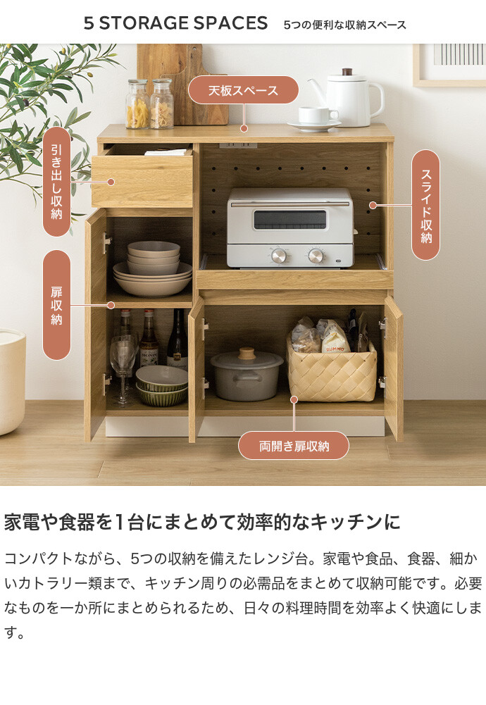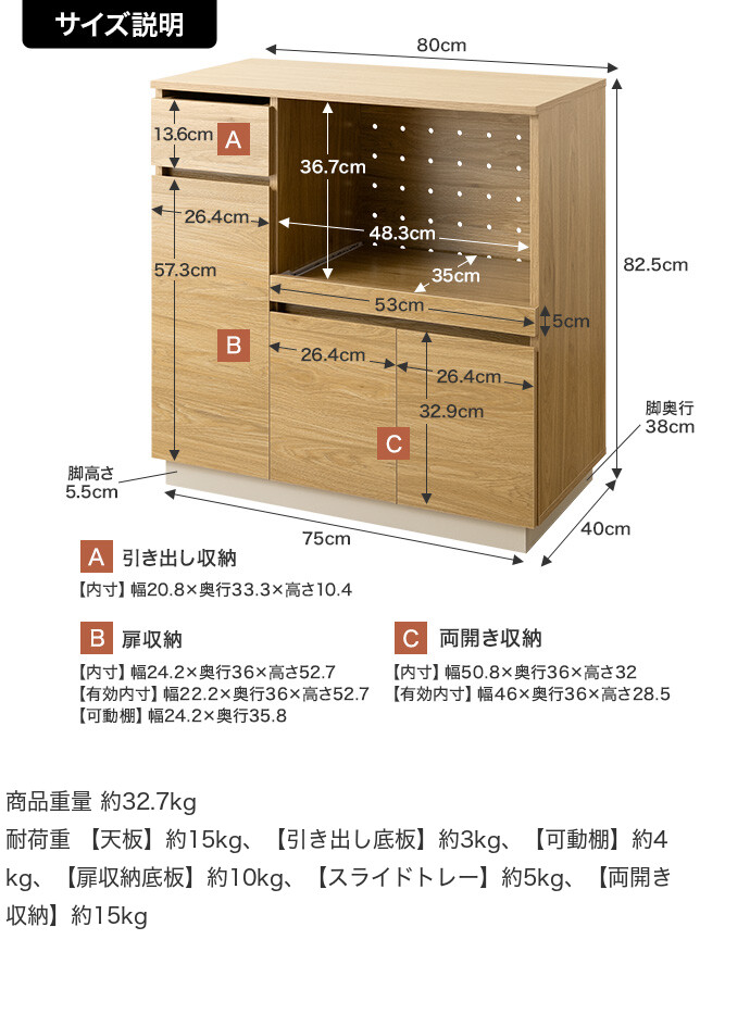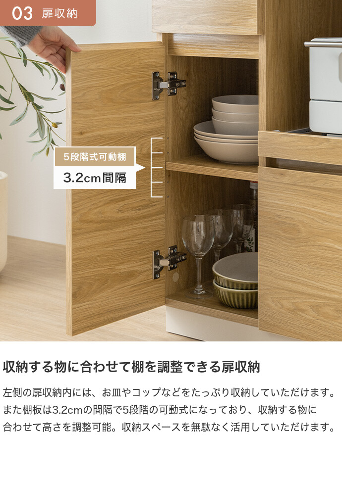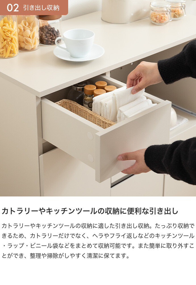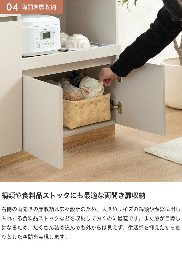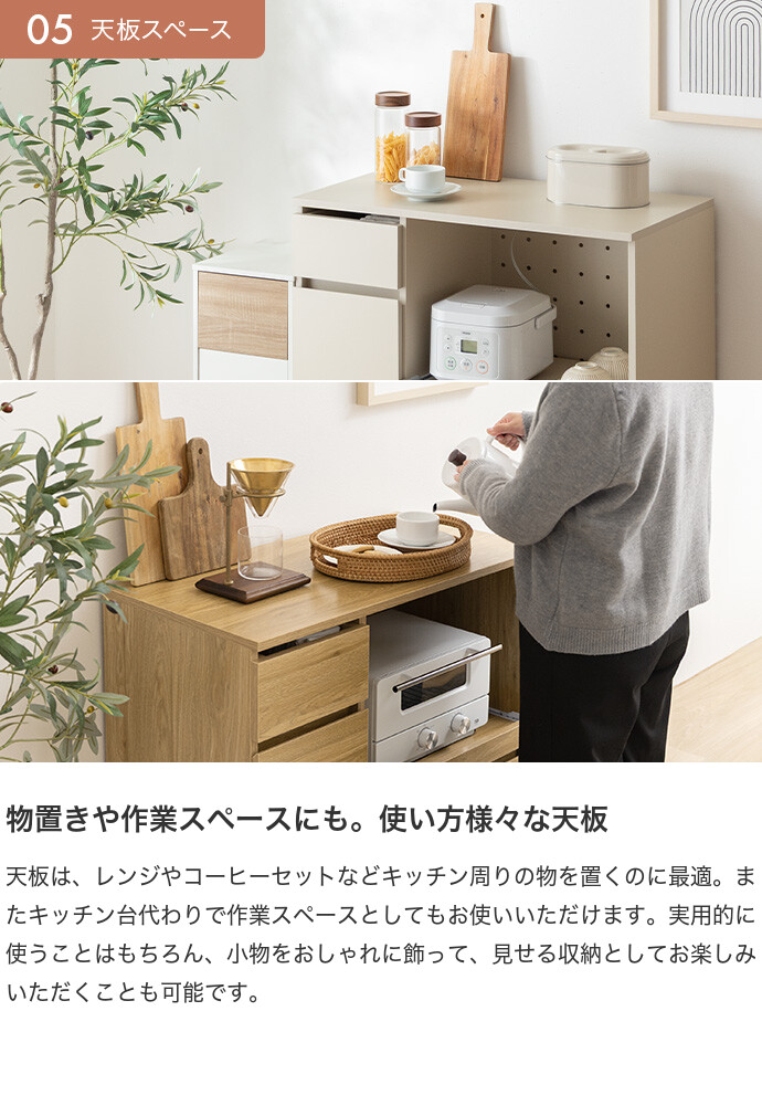 【耐荷重】天板:約15kg、引き出し:約3kg、可動棚:約4kg、扉収納底板:約10kg、スライドトレー:約5kg、両開き収納:約15kg