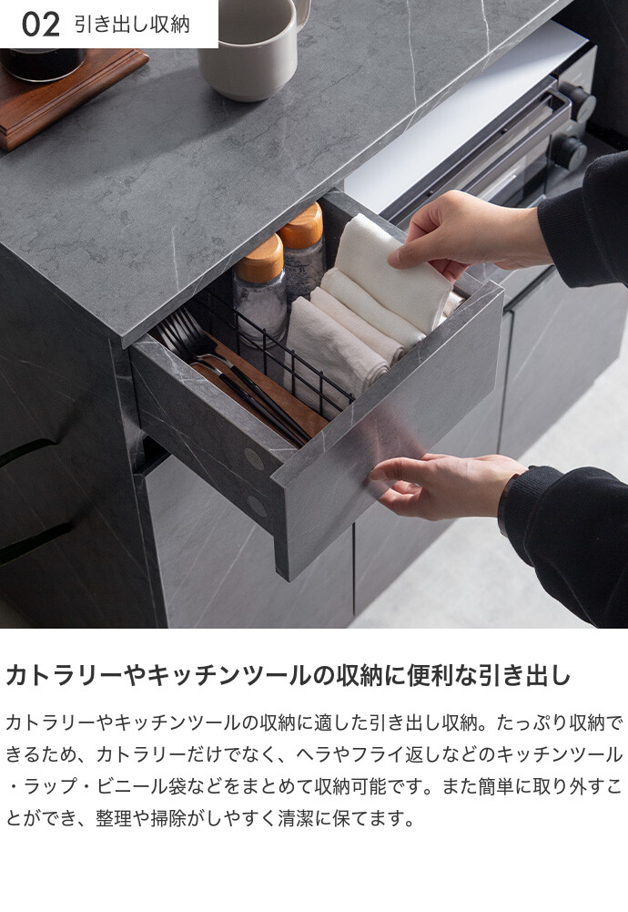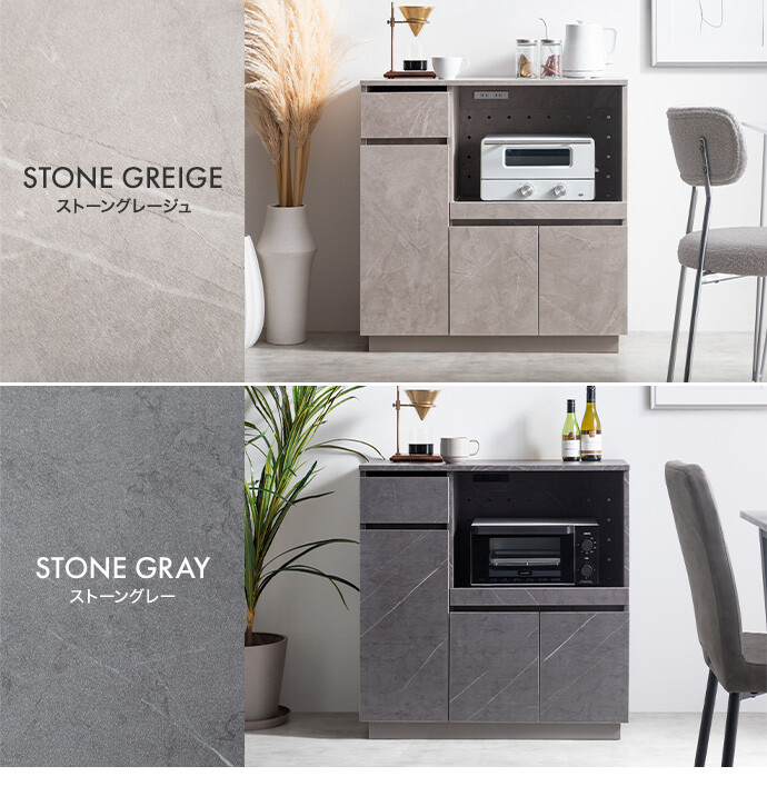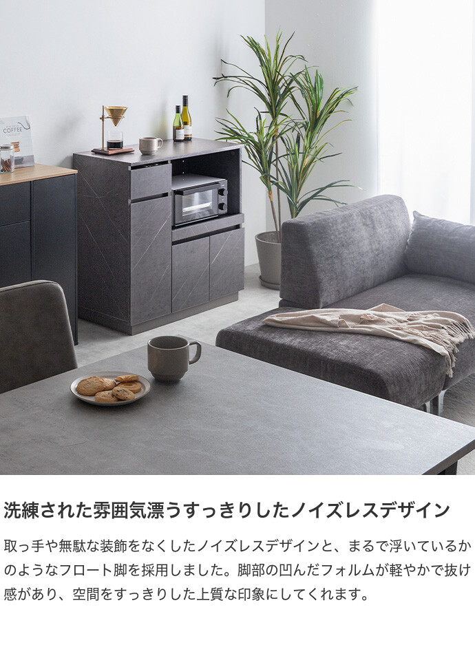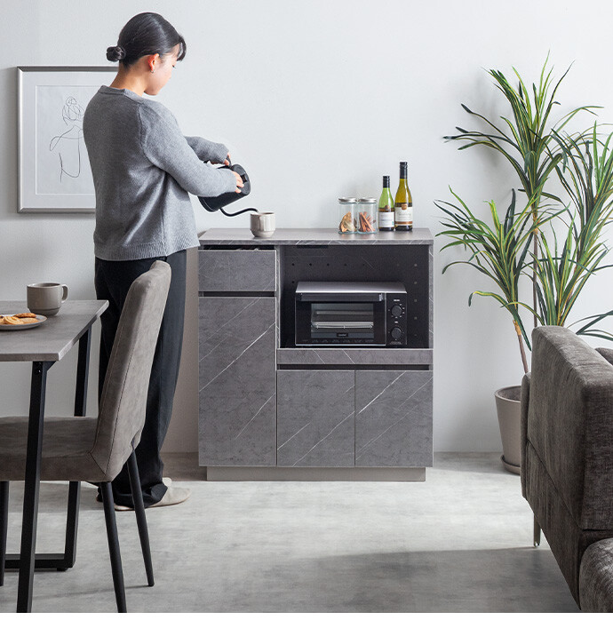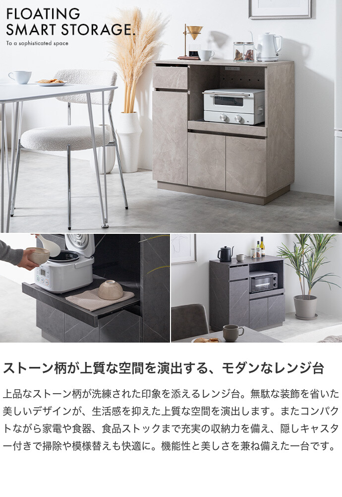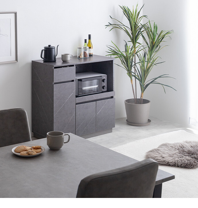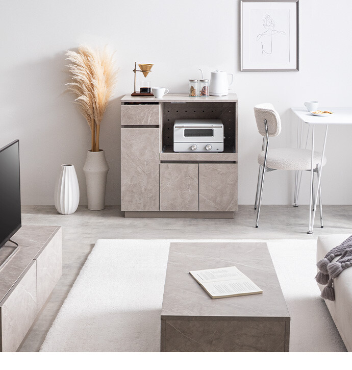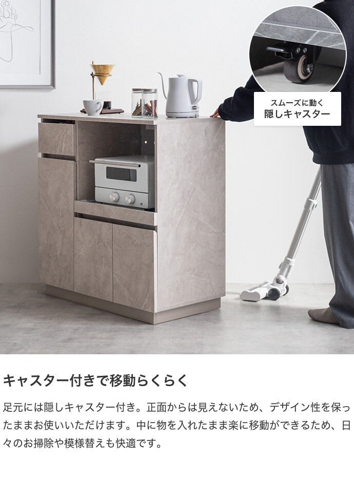 自然な風合いを感じるストーン柄が印象的な、洗練されたデザインのレンジ台。高級感のある佇まいが、キッチンをワンランク上の空間へと導きます。シンプルな見た目ながら収納力はしっかり備えており、家電や食器・小物などのキッチン用品をまとめて収納が可能。さらに足元には隠しキャスター付きで、掃除や模様替えも簡単に行える、使い勝手抜群のレンジ台です。