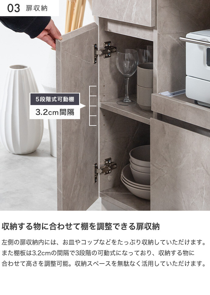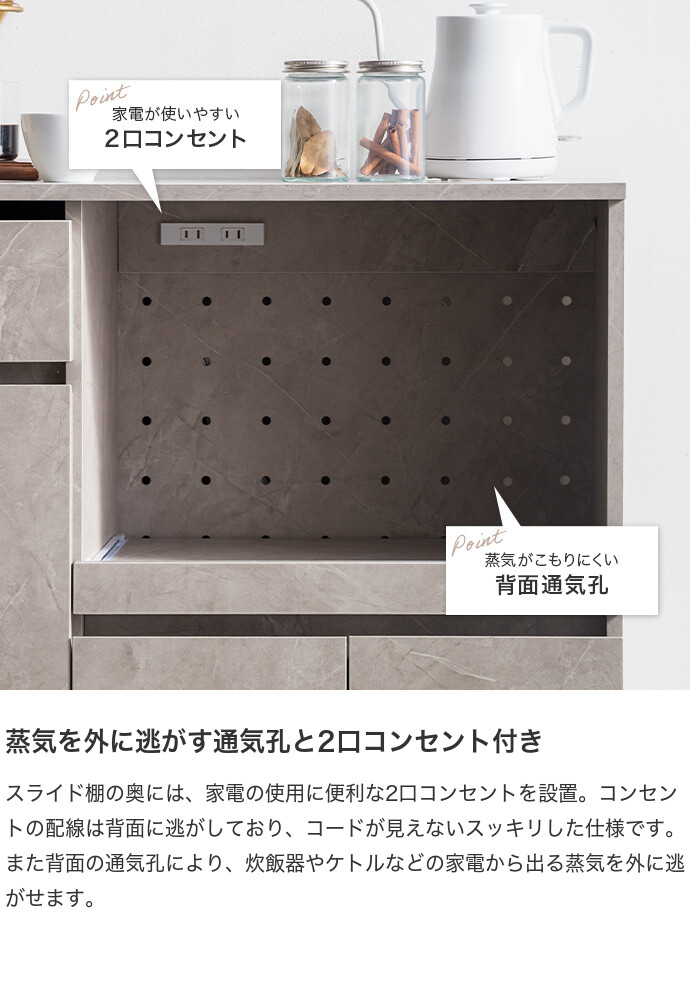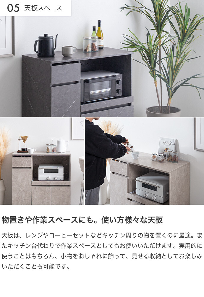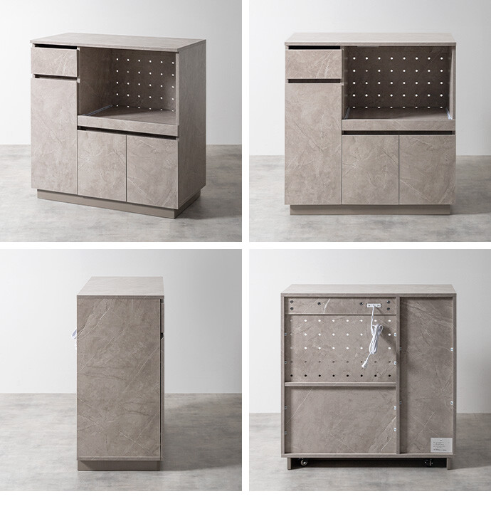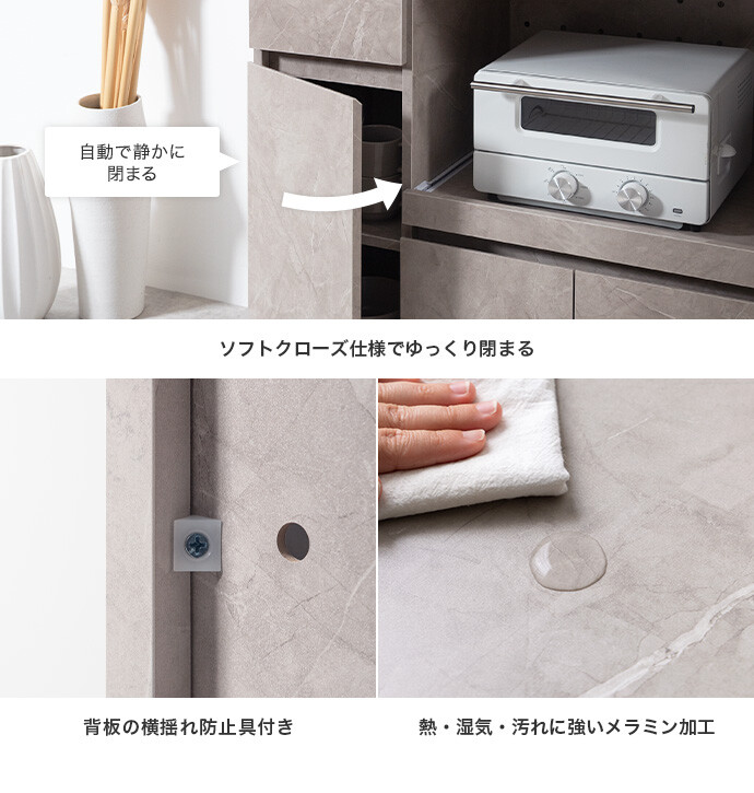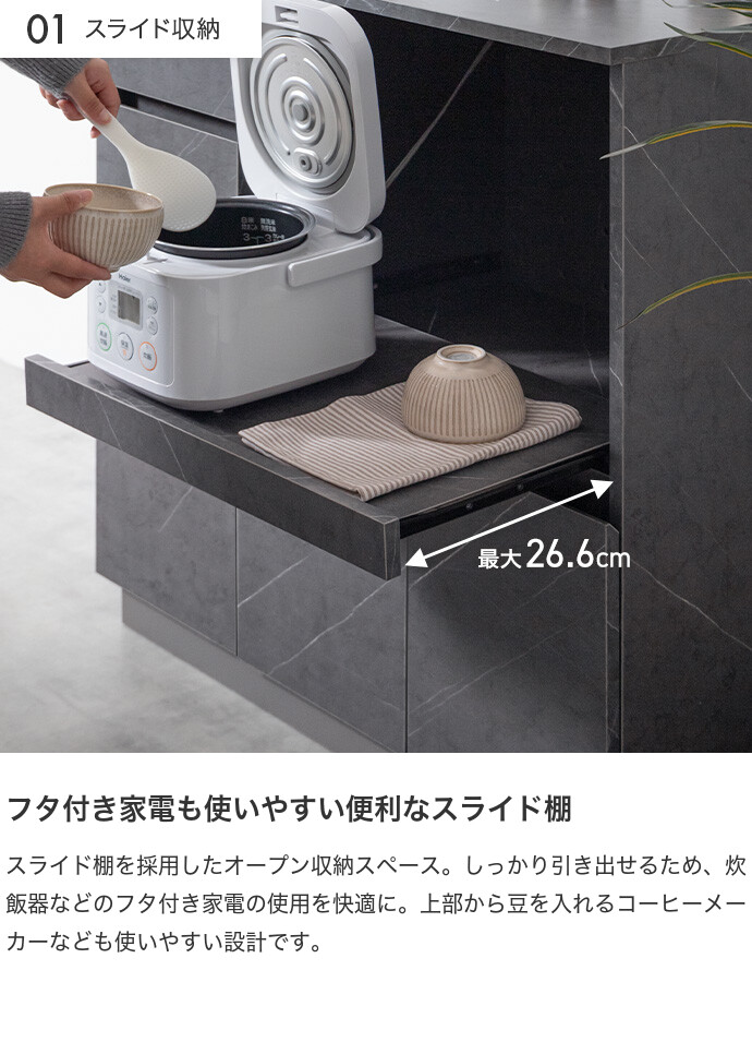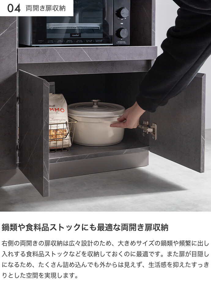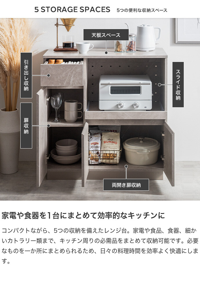 自然な風合いを感じるストーン柄が印象的な、洗練されたデザインのレンジ台。高級感のある佇まいが、キッチンをワンランク上の空間へと導きます。シンプルな見た目ながら収納力はしっかり備えており、家電や食器・小物などのキッチン用品をまとめて収納が可能。さらに足元には隠しキャスター付きで、掃除や模様替えも簡単に行える、使い勝手抜群のレンジ台です。