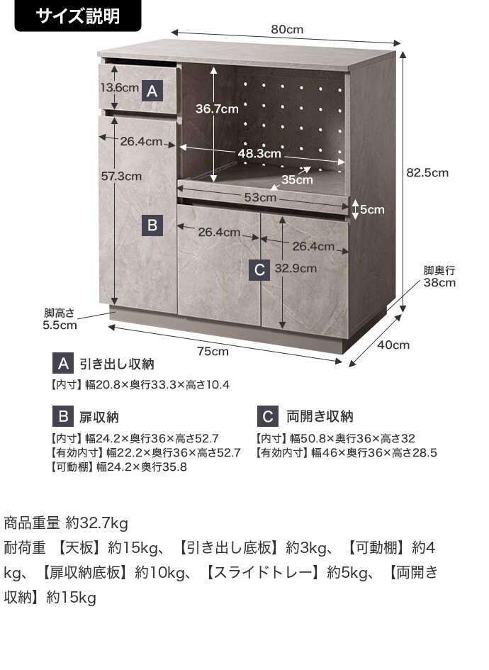 【耐荷重】天板:約15kg、引き出し:約3kg、可動棚:約4kg、扉収納底板:約10kg、スライドトレー:約5kg、両開き収納:約15kg