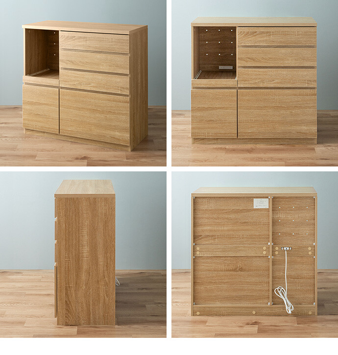 たっぷり収納でキッチン空間が整うレンジ台。コンパクトながら4杯の引き出し、オープン収納、扉収納を備え、充実した収納力を実現しました。たっぷりお皿やお鍋を収納でき、キッチン周りの様々なものをこの1台にまとめて収納していただけます。また天板はカウンターとしても使えるため、調理時の作業台としてもぴったり。省スペースで置きやすいサイズ感なので、ワンルームや一人暮らしの方にもおすすめのレンジ台です。
