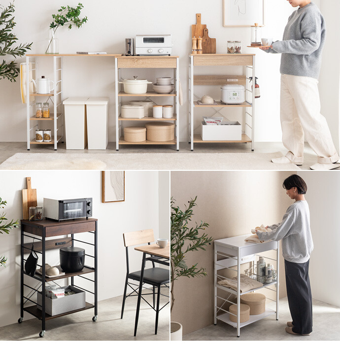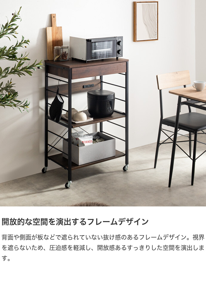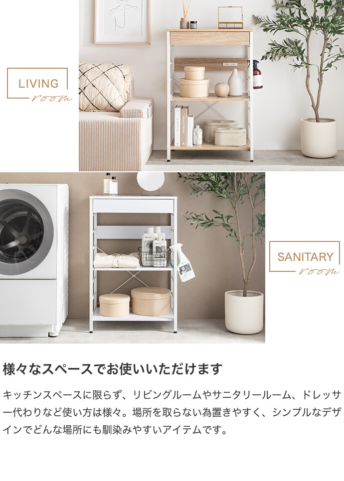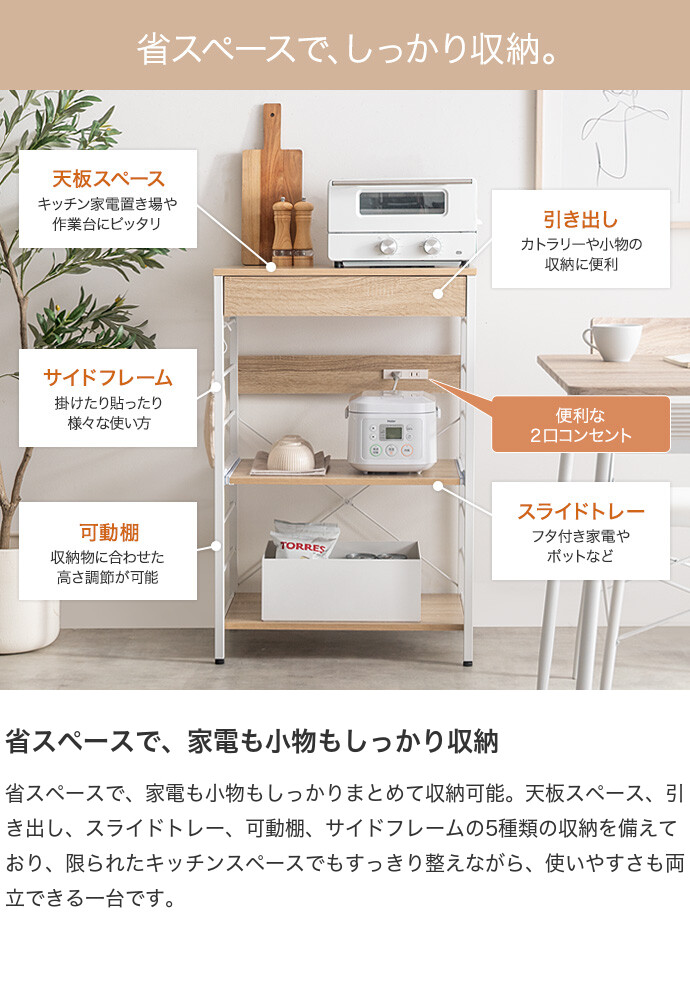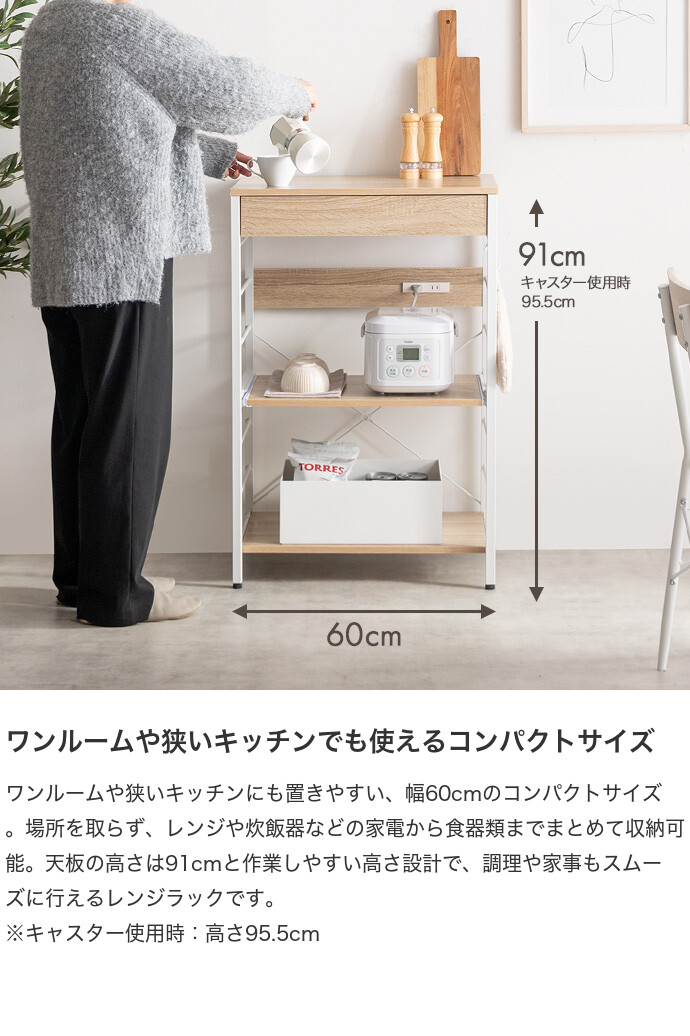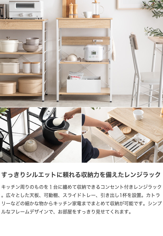 キッチン周りのものを1台に纏めて収納できるコンセント付きレンジラック。広々とした天板、可動棚、スライド収納、引き出しを備えており、カトラリーなどの細かな物からキッチン家電までまとめて収納が可能。また幅60cmのコンパクト設計で、限られたスペースにも設置ができ、キッチンに限らず、リビングルームやサニタリールームなど様々な場所で活用いただけます。
