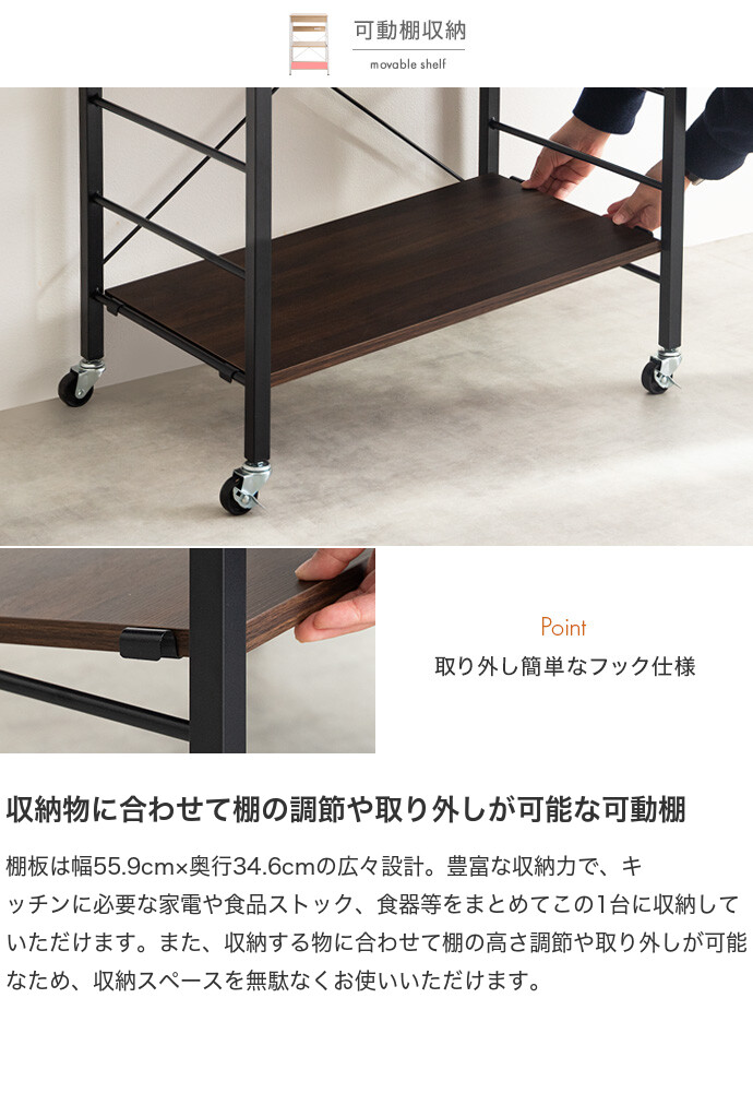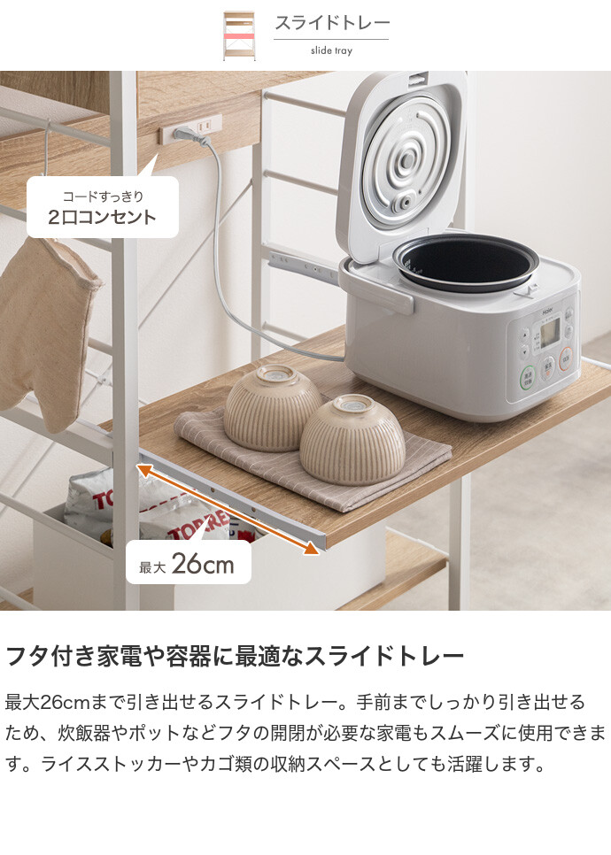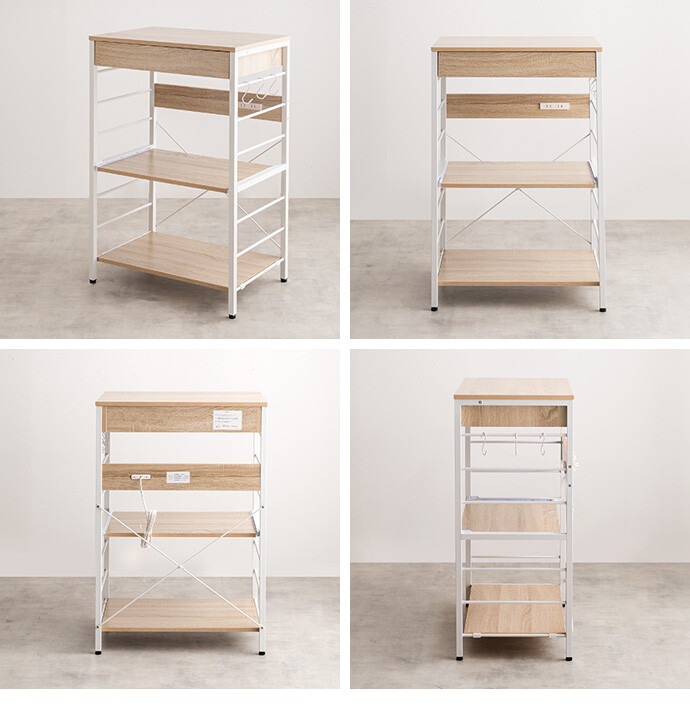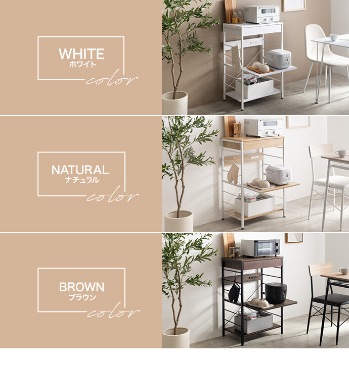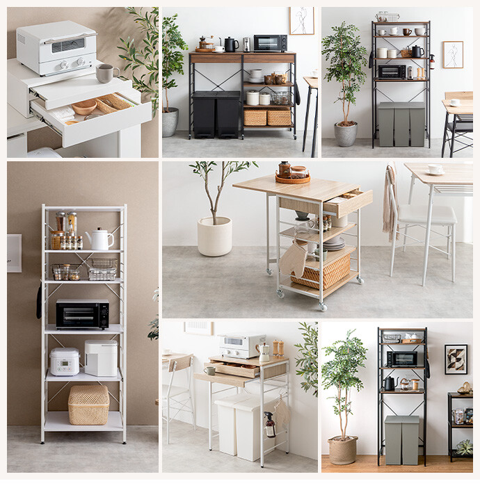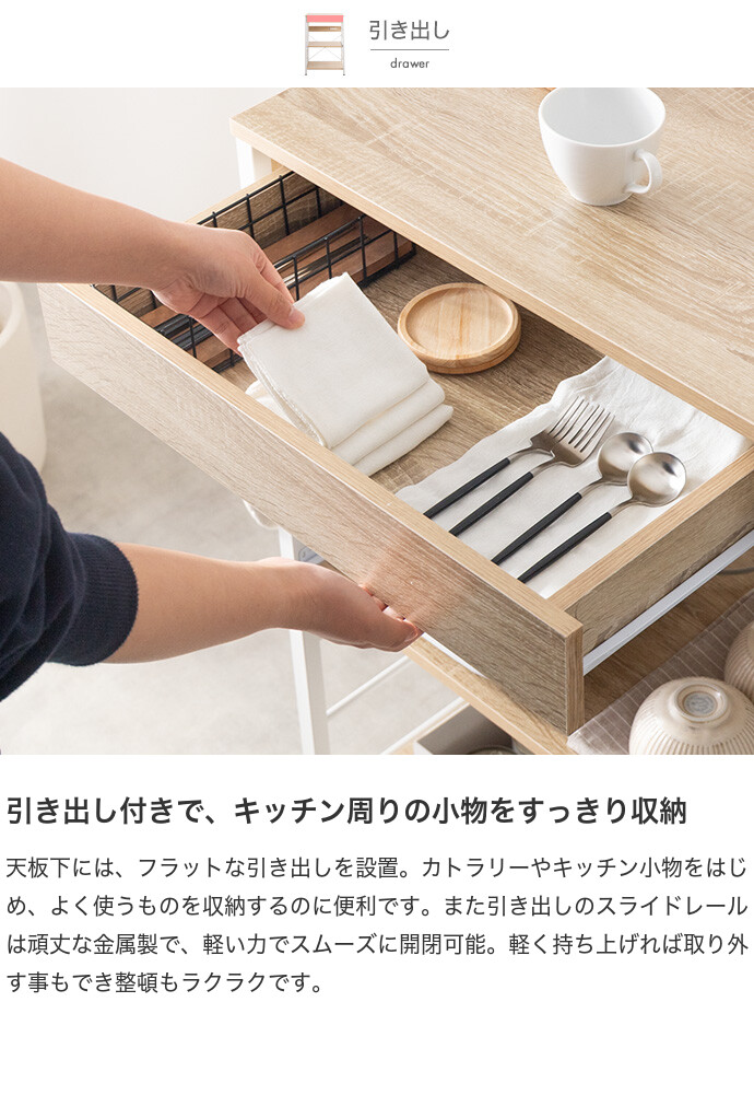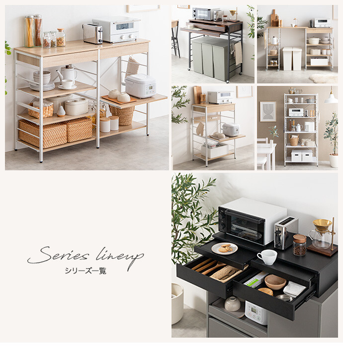 キッチン周りのものを1台に纏めて収納できるコンセント付きレンジラック。広々とした天板、可動棚、スライド収納、引き出しを備えており、カトラリーなどの細かな物からキッチン家電までまとめて収納が可能。また幅60cmのコンパクト設計で、限られたスペースにも設置ができ、キッチンに限らず、リビングルームやサニタリールームなど様々な場所で活用いただけます。