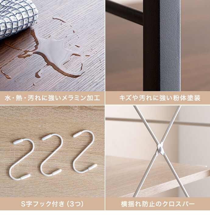 【耐荷重】天板:約15kg、スライドトレー:約10kg、可動棚:約5kg、引き出し:約5kg、S字フック:各約2kg