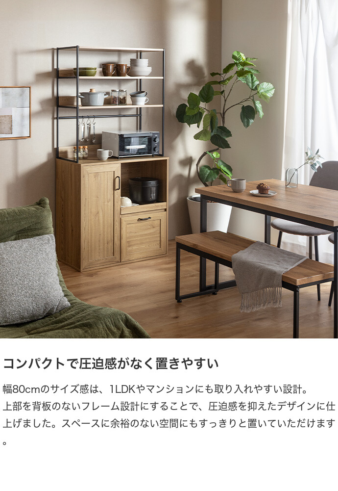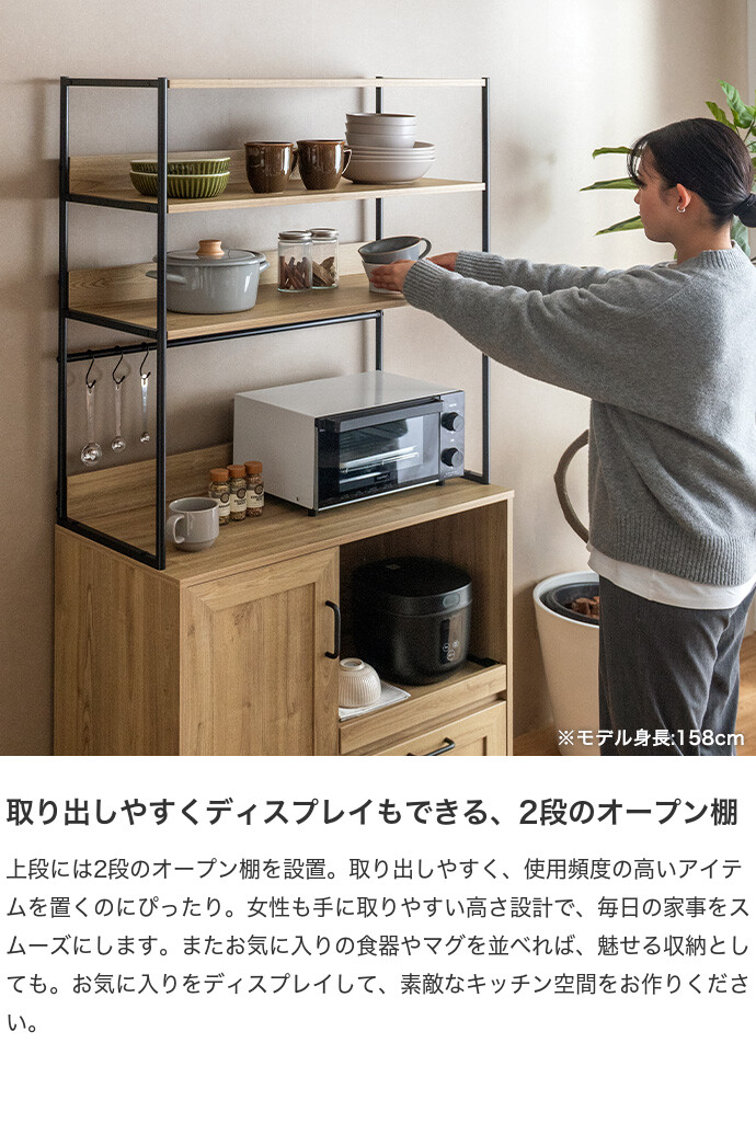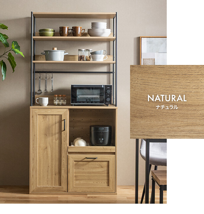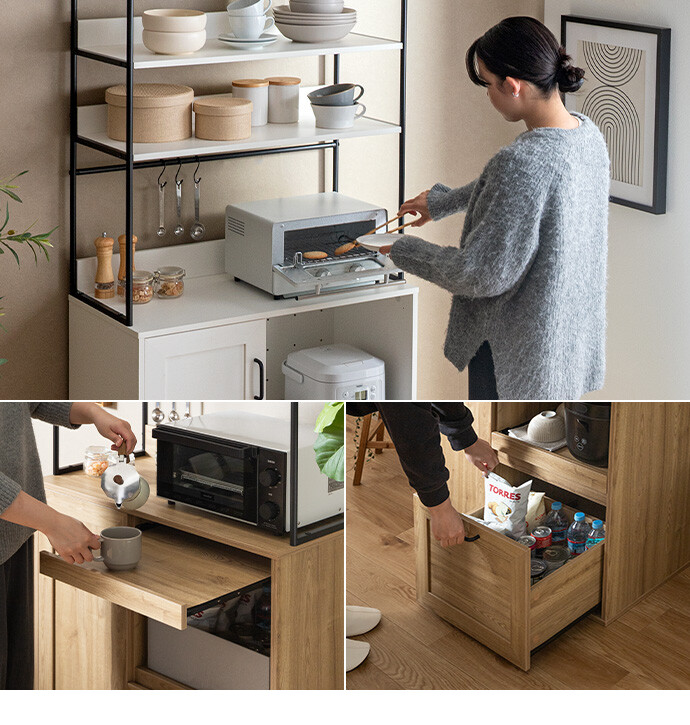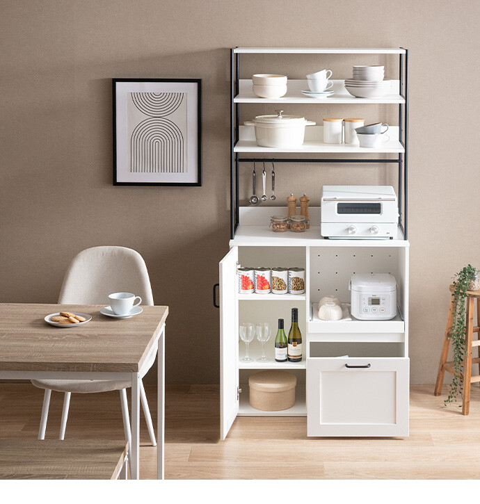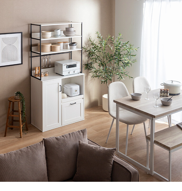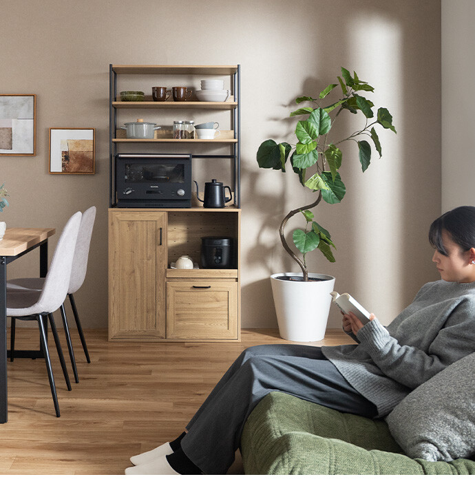 キッチン家電や食器類をこれ一台にまとめて、美しく収納できるオープン棚キッチン収納。 6種類の多彩な収納スペースを備えているため、散らかりがちなキッチンアイテムをすっきり整理でき、動線まで整った快適な空間をつくります。必要なものがすぐ手に取れることで、毎日の家事をスムーズに。 また、ブラックスチールのフレームが程よくヴィンテージ感を添え、空間を引き締めながら上質な印象に導きます。