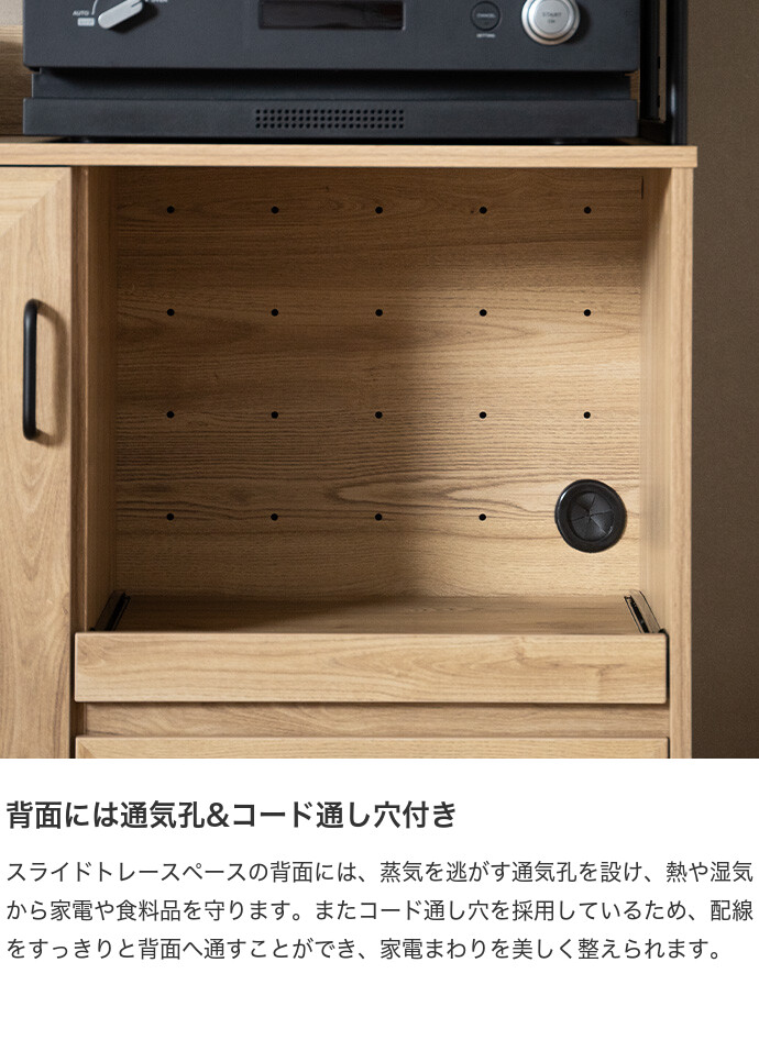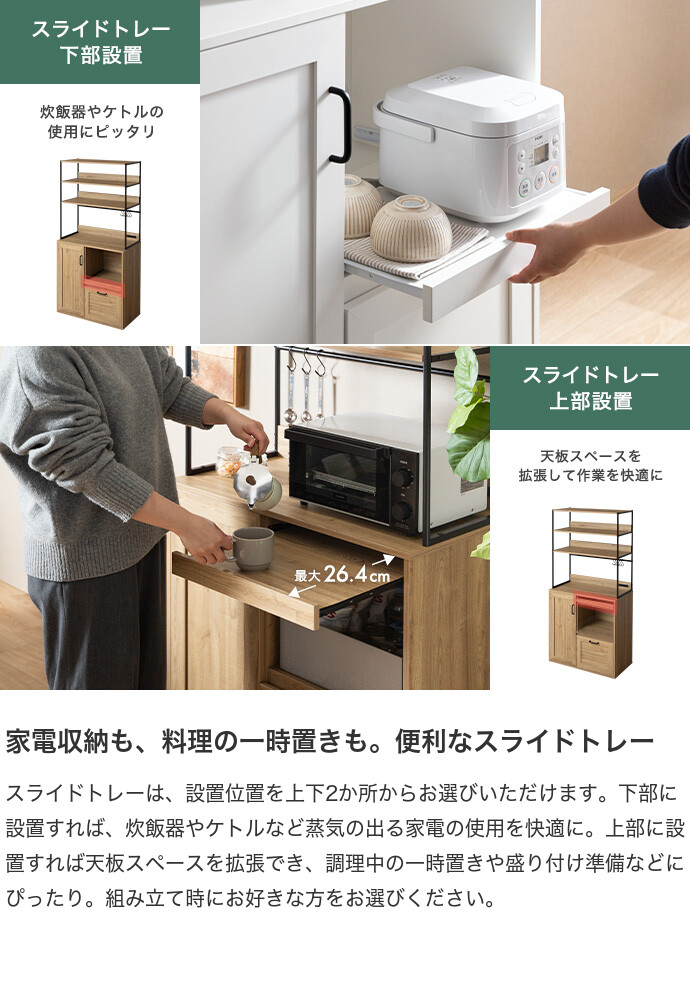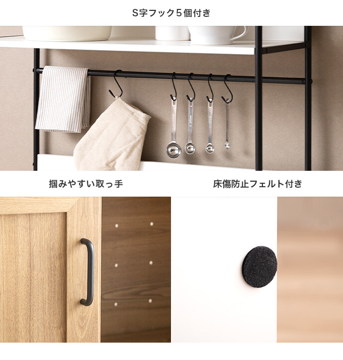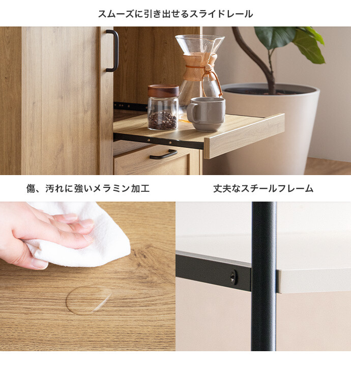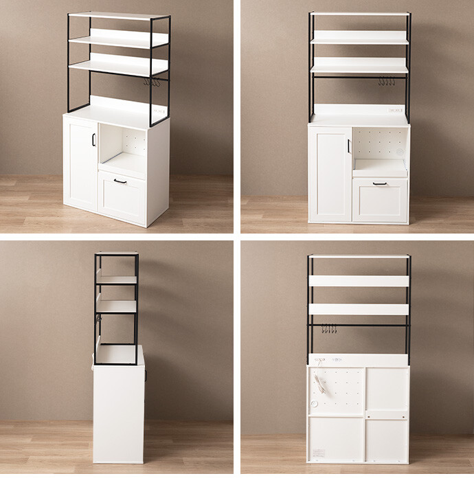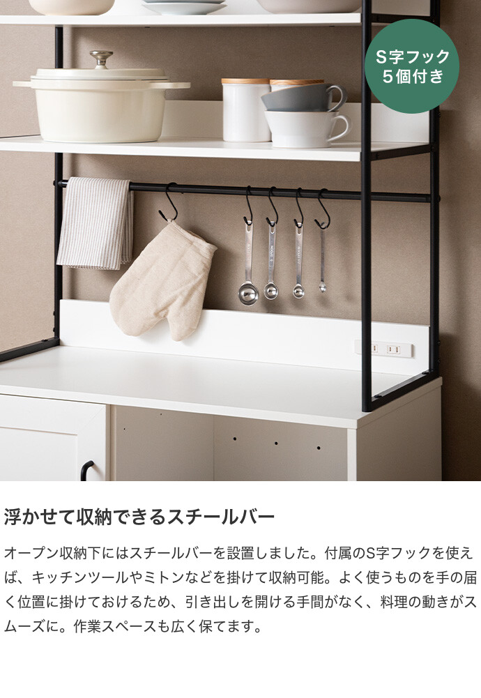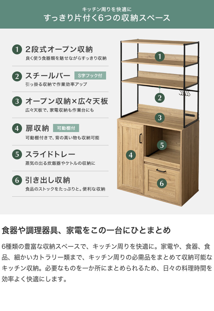 キッチン家電や食器類をこれ一台にまとめて、美しく収納できるオープン棚キッチン収納。 6種類の多彩な収納スペースを備えているため、散らかりがちなキッチンアイテムをすっきり整理でき、動線まで整った快適な空間をつくります。必要なものがすぐ手に取れることで、毎日の家事をスムーズに。 また、ブラックスチールのフレームが程よくヴィンテージ感を添え、空間を引き締めながら上質な印象に導きます。