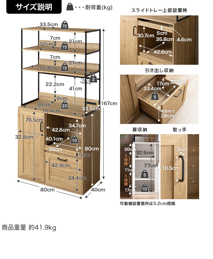 扉収納可動棚:(各)約5kg、扉収納底板:約10kg、スライドトレー:約10kg、引き出し底板:約5kg