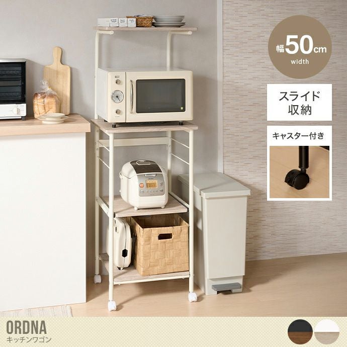 キッチンのちょっとしたすき間にもすっと収まる『Ordna(オルドナ)』キッチンワゴン。必要な機能はしっかりと詰め込みながらも、幅50cmとコンパクトなサイズ感で場所を選ばず設置可能。ワンルームや一人暮らしの方にもおすすめです。カラーはブラウンとナチュラルの2色をご用意。お好きなカラーをお選びください。