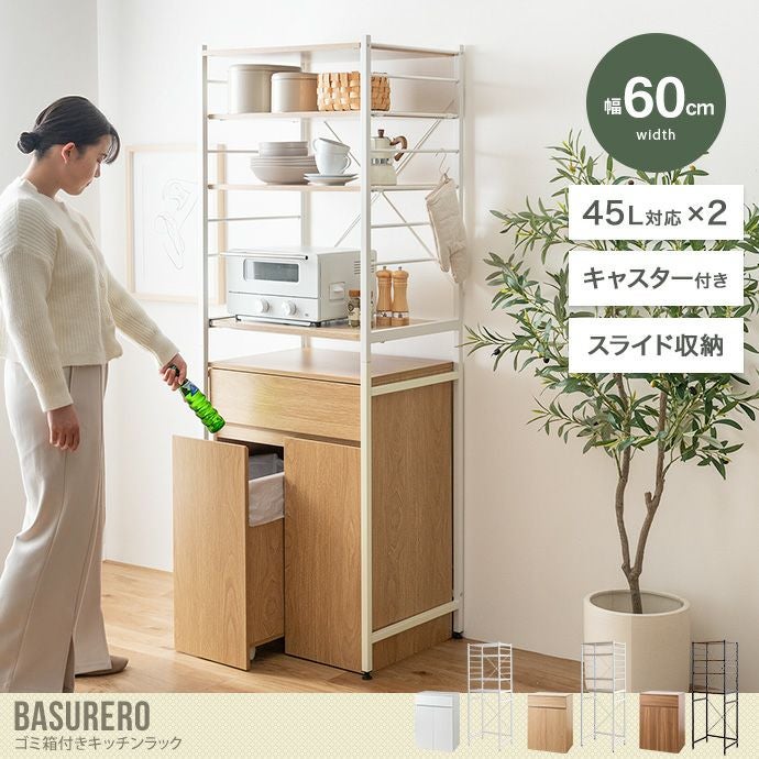 【送料無料】Basurero バスレーロ 幅60 ゴミ箱付きキッチンラック ごみ箱 食器棚 レンジ台 レンジラック キッチン ランドリー 収納 45リットル 45L 分別 キャスター付き 2つ スリム 大容量 引き出し ハイタイプ ホワイト