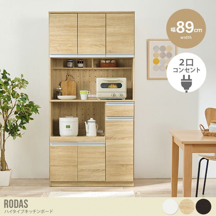 【送料無料】幅89 キッチンボード ハイタイプ 幅89×奥行40×高さ182cm キッチン収納 キッチンキャビネット 食器収納 家電収納 大容量収納 2口コンセント付 組立式 木目 作業スペース ホワイト