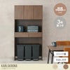 ゴミ箱上を有効活用しながら、おしゃれにキッチン周りの収納ができる『Karlskrona(カールスクルーナ)』のゴミ箱上キッチンラック。ゴミ箱以外にも、食材のストックやスツールなども収納でき、スライド棚と引出し付きでキッチン家電やカトラリーなどをまとめて収納していただけます。幅88cmで、比較的コンパクトなサイズなので、一人暮らしや省スペースの場所にもお使いいただけます。扉つき仕様なのでホコリもかからずスッキリと収納できます。