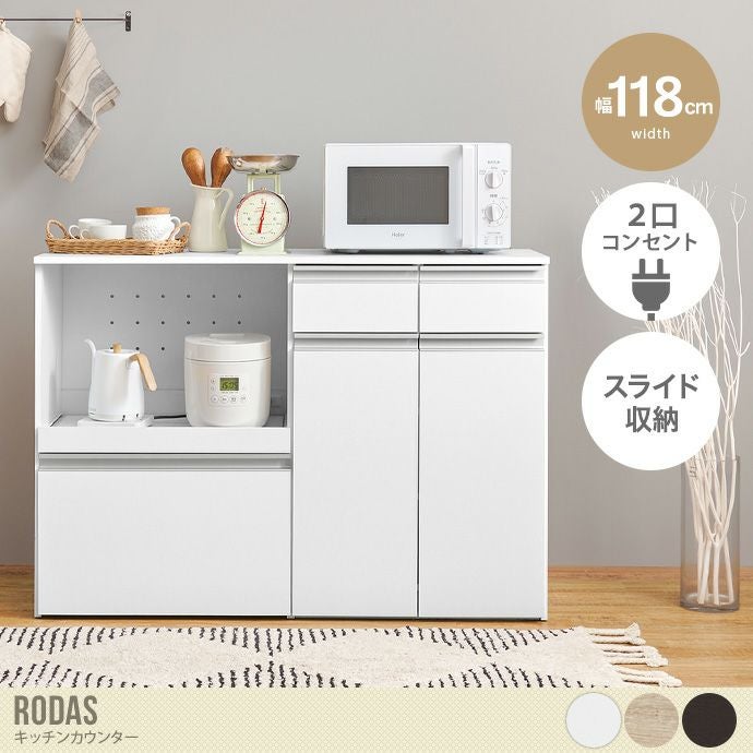 お部屋やキッチンにスッと馴染む『Rodas(ローダス)』キッチンカウンター。複数の収納スペースを備えており、かさばる食器や調理器具、家電などもひとまとめに収納可能。大容量ながら奥行40cmとスリム設計のため、省スペースで設置していただけます。また水や汚れに強い素材を使用しているため、お手入れもラクに。清潔かつ衛生的にお使いいただけます。さらにカラーはホワイト、ナチュラル、ダークブラウンの3色をご用意しました。お部屋のテイストに合わせてお好きなカラーをお選びください。