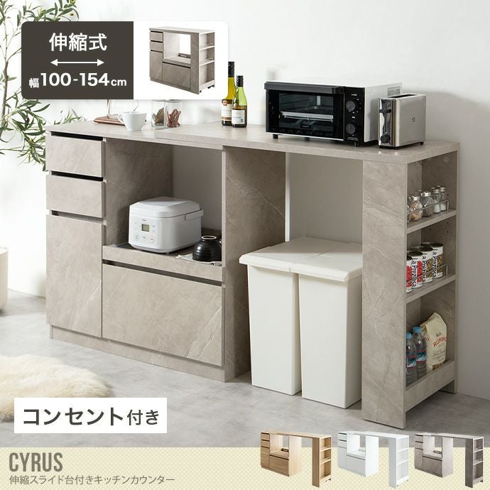 【送料無料】Cyrus サイラス 幅100 幅154 キッチンカウンター 伸縮式 レンジ台 収納 コンセント付き 間仕切り テーブル ゴミ箱上 対面式 調理台 作業台 スライド棚 伸長 伸びる 天板拡張 背面 台所 引き出し 扉付き 食器棚 炊飯器 ナチュラル