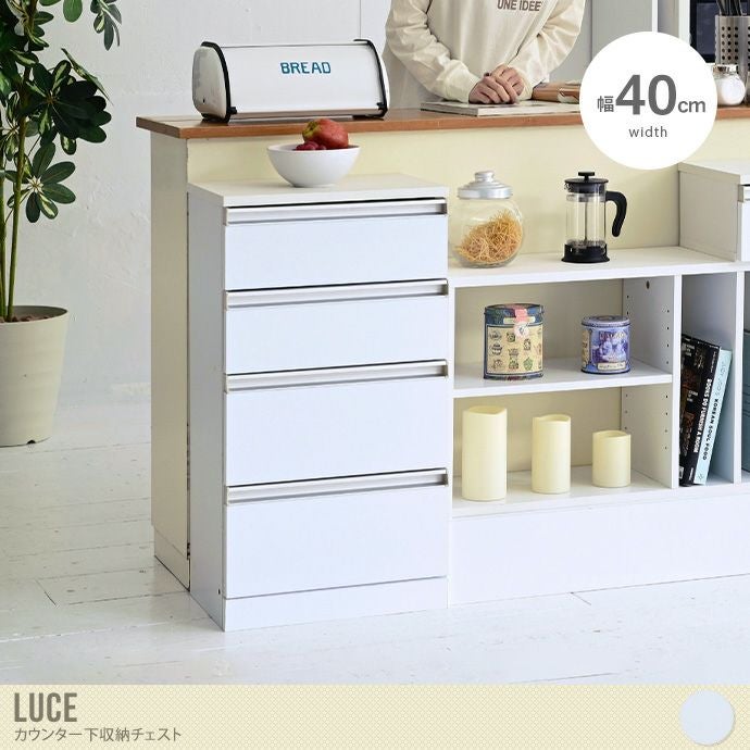 【送料無料】幅40 チェスト 4段 リビング カトラリー 調味料 キッチンチェスト カウンター下収納 コンパクト サイドチェスト 引き出し 収納 木製 スリム 薄型 鏡面 Luce 耐水性 空間活用 間切り 窓下収納 ホワイト