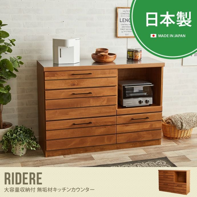 シンプルなデザインと大容量の収納スペースが特徴的なキッチンカウンター「Ridere 大容量収納付 無垢材キッチンカウンター」。美しい木目で木の温もりを感じていただけるキッチンカウンターとなっております。