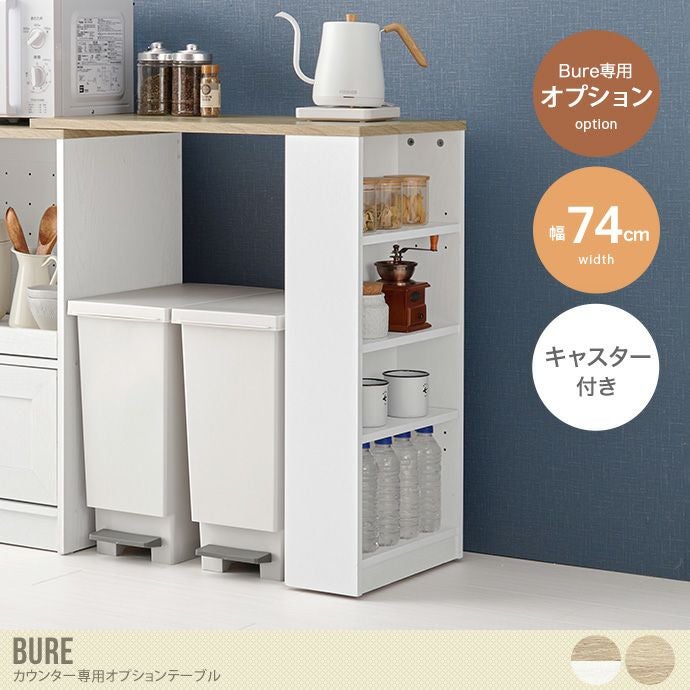 インテリアに馴染むおしゃれな木目調デザインのカウンター専用オプションテーブル『Bure(ビュール)』が登場しました。スペースに合わせて幅を自由に調節できるので、置きたい場所にぴったりフィット。高さは84cmと小柄な方でも作業しやすい高さになっているので、コーヒーを入れたり料理を盛りつけたりキッチンでの動作もラクにしていただけます。またサイドには3cmピッチで調節できる可動棚が付いているので、ごちゃつくキッチン周りの小物もスッキリ収納することが可能です。