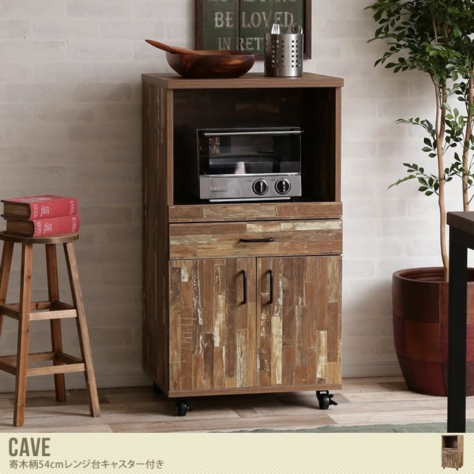 幅54cmとコンパクトサイズながら、オープン棚、引き出し、開き戸収納があるので、家電製品やキッチン小物がスッキリと効率良く収納できるレンジ台です。しかも見た目がとってもオシャレ♪色の異なる古材が組み合わされたような“寄木”を思わせる寄木柄で、アイアン製の取っ手がアクセントになってヴィンテージ感あふれるデザインになっています。これでキッチンインテリアもばっちり決まります!