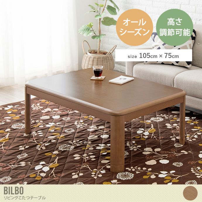 優しい木目調のリビングこたつ『Bilbo(ビルバオ)』。角が丸くシンプルなデザインは、和室にも洋室にも合わせやすいデザインです。テーブルは高さが2段階で調節が可能。使うシーンに合わせて快適に使っていただけます。