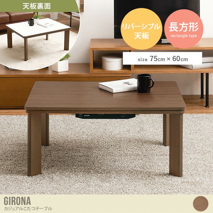 シンプルな木目調のカジュアルこたつ『Girona(ジローナ)』長方形タイプ。ひとり暮らしでも使いやすいコンパクトサイズです。天板は両面使えるリバーシブルタイプで気分によって色味を変えて使っていただけます。シンプルな木目調デザインなので、使うインテリアを選びません。