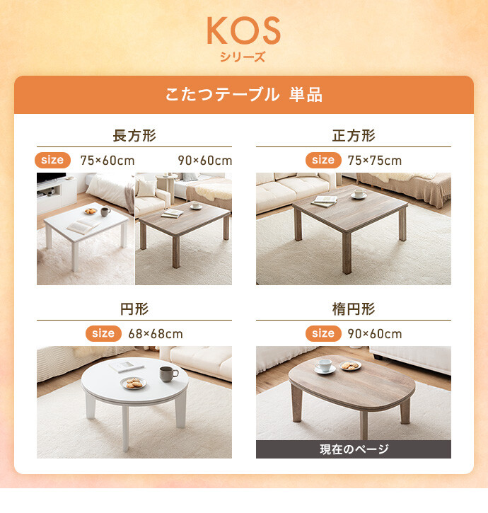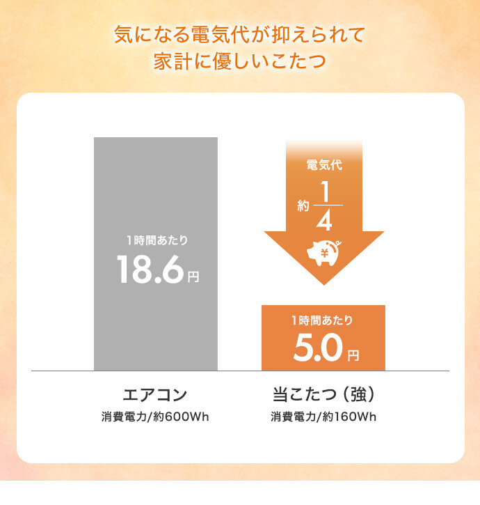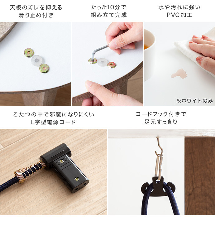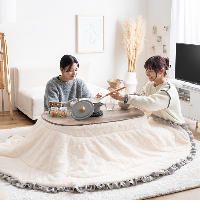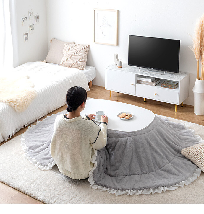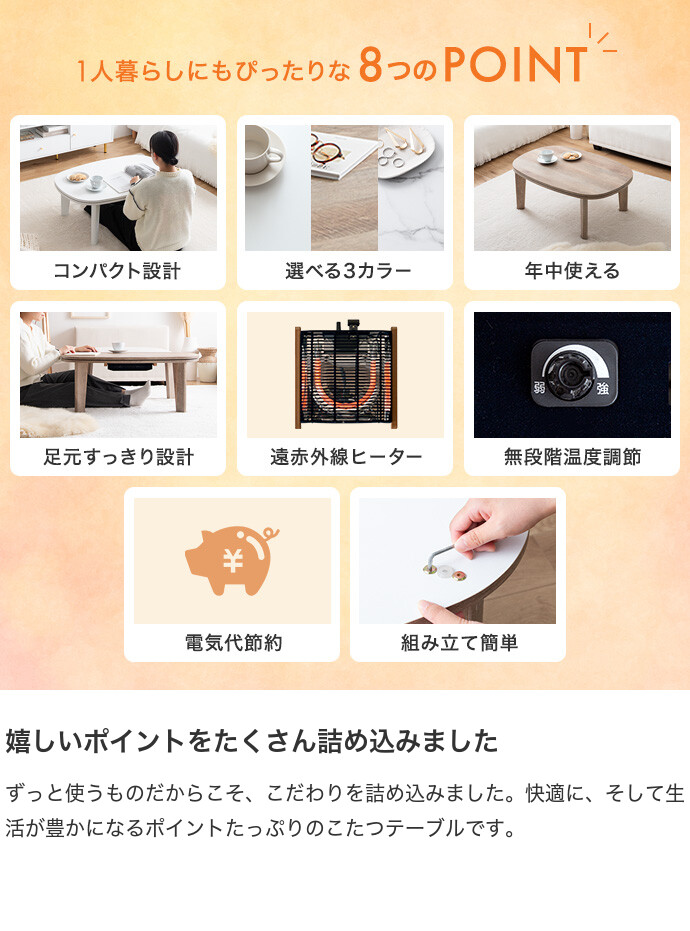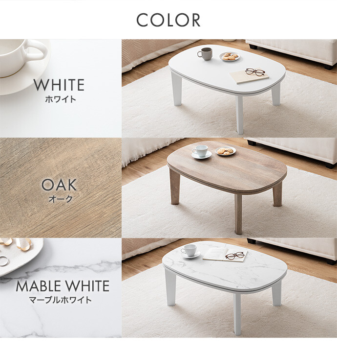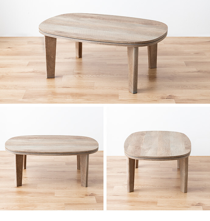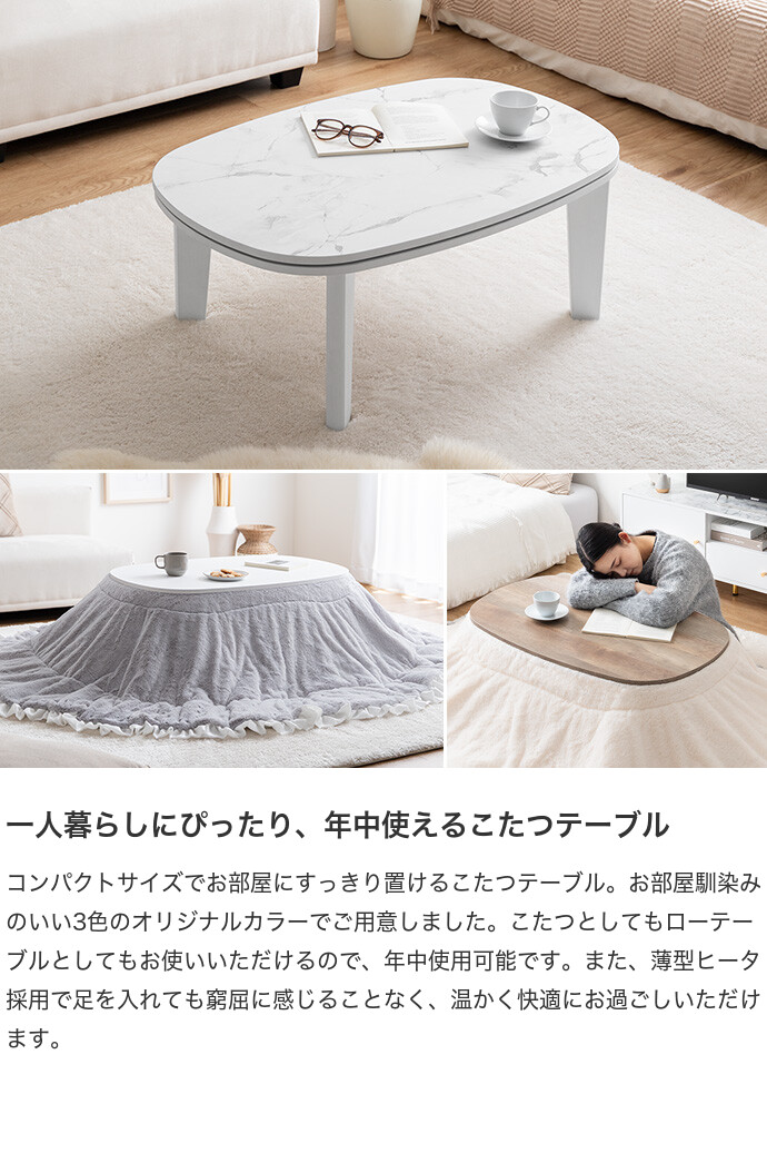 コンパクトサイズでお部屋にすっきり置けるこたつテーブル。お部屋馴染みのいい3色のオリジナルカラーでご用意しました。こたつとしてもローテーブルとしてもお使いいただけるので、年中使用可能です。また、薄型ヒータ採用で足を入れても窮屈に感じることなく、温かく快適にお過ごしいただけます。