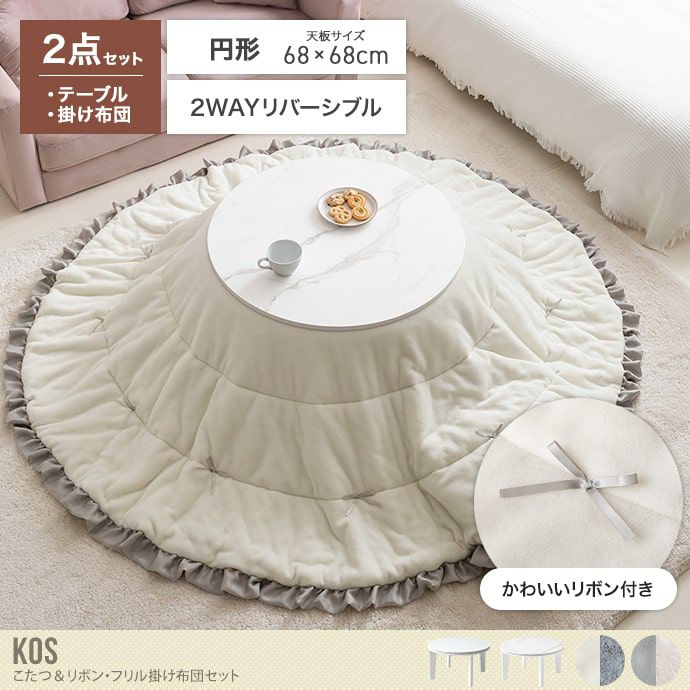 【送料無料】68×68 197×197 こたつ こたつテーブル コタツ こたつセット 円形 丸型 布団セット 洗える こたつ布団 リバーシブル おしゃれ おすすめ 安い こたつ掛け布団 コンパクト 一人暮らし ワンルーム リボン フリル かわいい 本体:ホワイト×布団:アイボリー