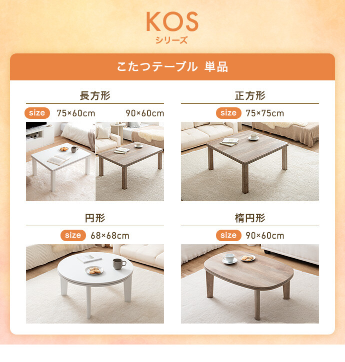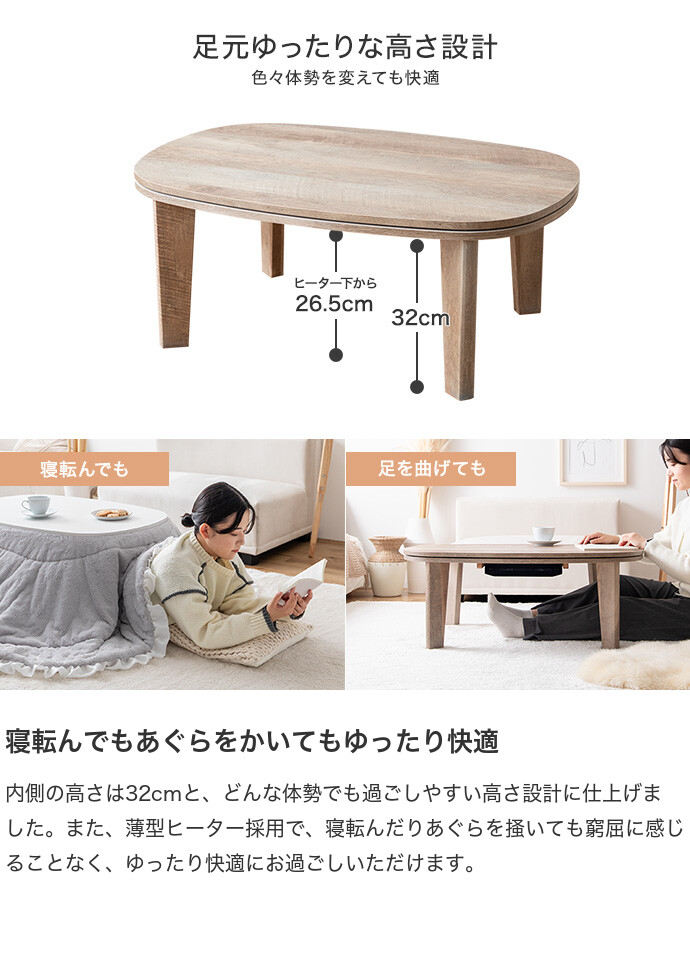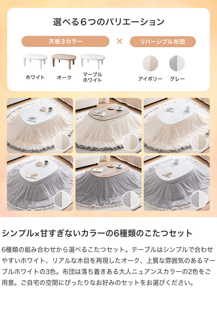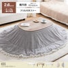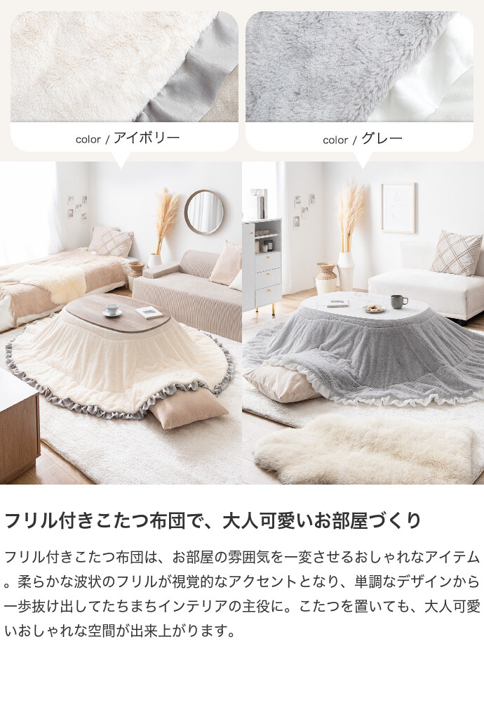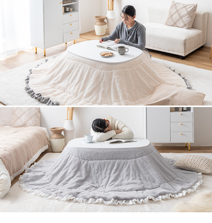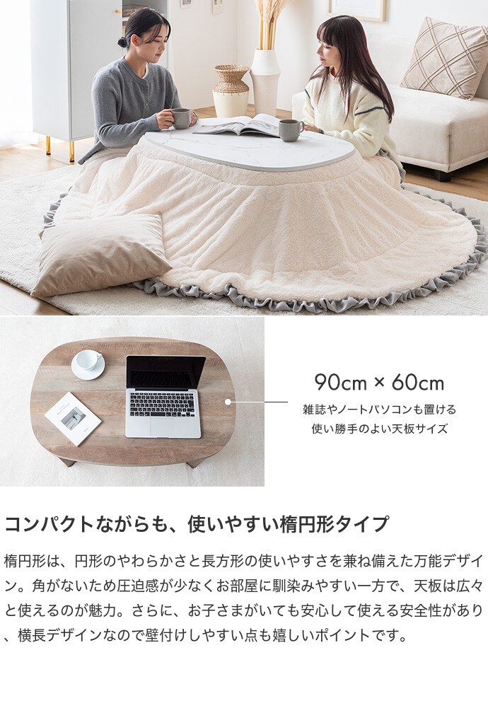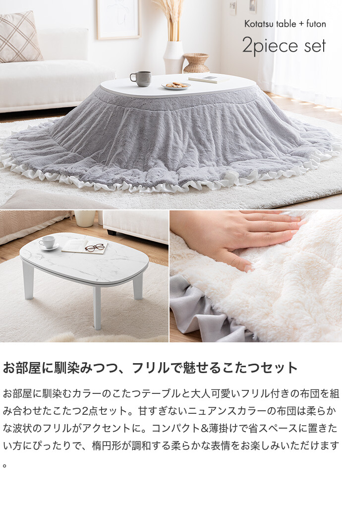 お部屋に馴染むカラーのこたつテーブルと大人可愛いフリル付きの布団を組み合わせたこたつ2点セット。甘すぎないニュアンスカラーの布団は柔らかな波状のフリルがアクセントに。コンパクト&薄掛けで省スペースに置きたい方にぴったりで、楕円形が調和する柔らかな表情をお楽しみいただけます。