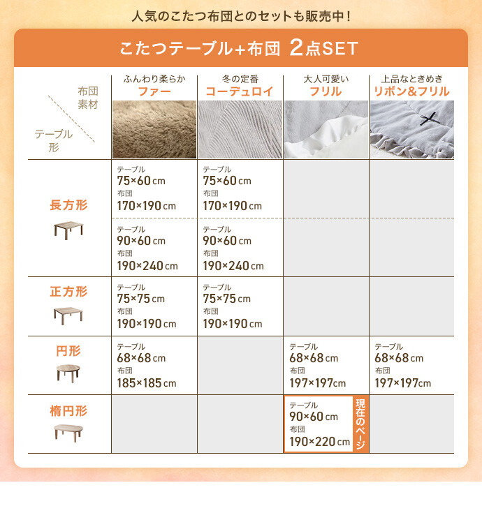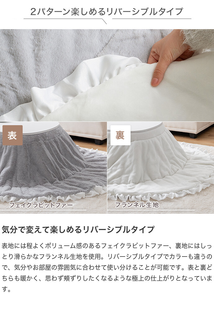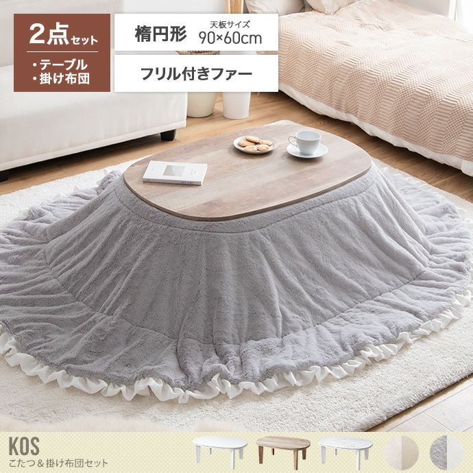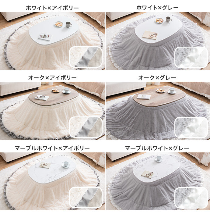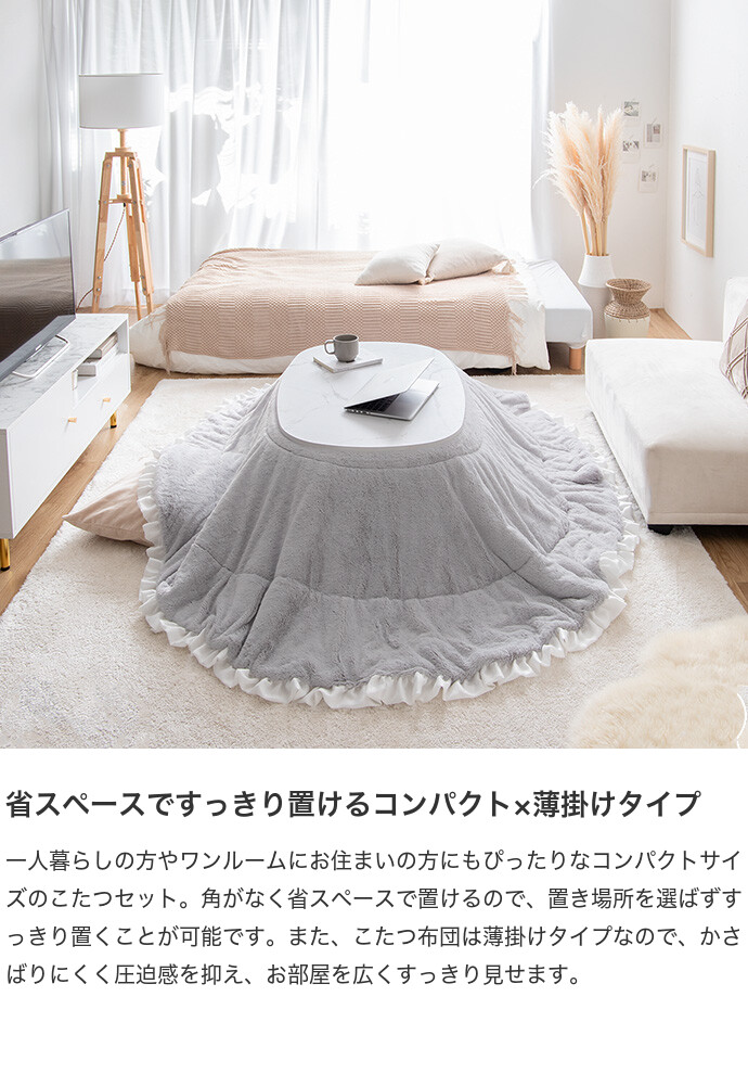 【送料無料】90cm×60cm 190cm×220cm こたつセット 2点 楕円 テーブル こたつ布団 炬燵 おしゃれ おすすめ 安い フリル付き リバーシブル 毛布 薄掛け 軽量 丸洗い 洗濯可 洗える 上掛け 一人暮らし コンパクト センターテーブル ロー 本体:ホワイト×布団:アイボリー