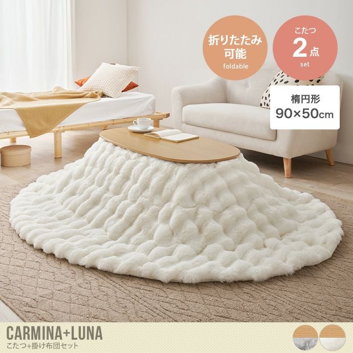 お部屋に馴染みやすい木目調の折りたたみ式こたつテーブルと、ラビットファー調のぽこぽことした見た目が可愛い布団が組み合わさった『Carmina(カルミナ)』こたつ2点セット。シンプルな見た目のこたつテーブルは、一人暮らしのお部屋にも置きやすいコンパクトなサイズ感で、冬だけでなくオールシーズンお使いいただけます。またふんわりとした触り心地抜群のこたつ布団は汚れても丸洗いが可能。いつでも清潔にお使いいただけます。
