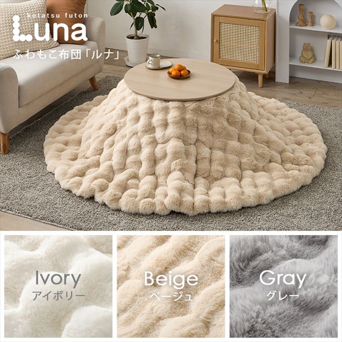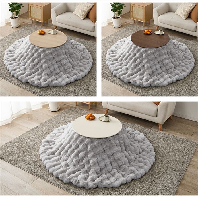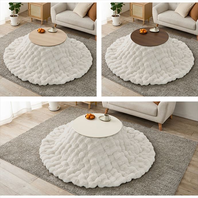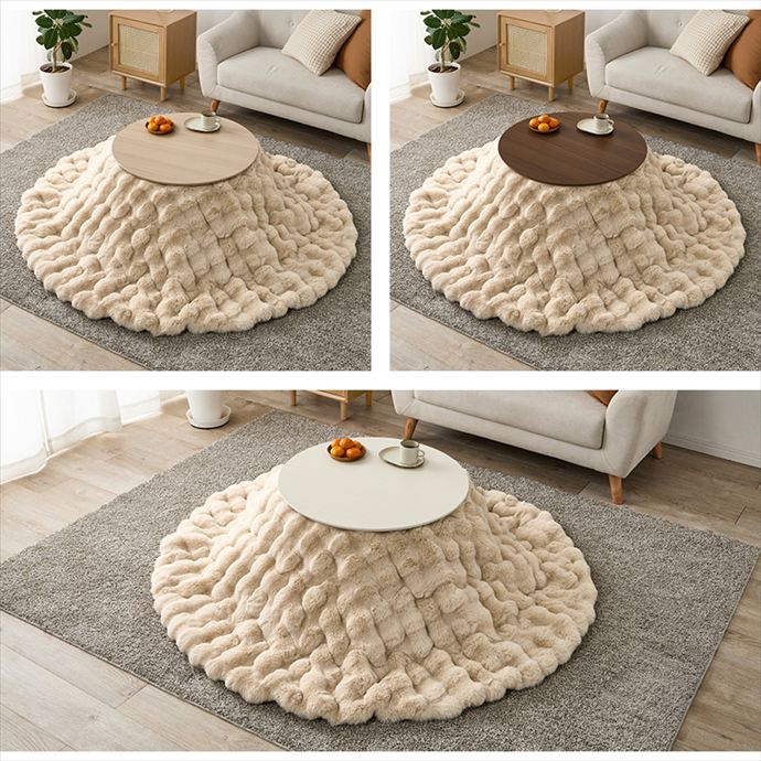 ころんとした丸みのあるフォルムが可愛らしいこたつテーブルと、やさしい肌触りのこたつ布団を組み合わせた2点セット。脚を折りたたむことができるコンパクトなテーブルは、ワンルームやスペースに限りのあるお部屋でも圧迫感を感じにくく、日常使いにちょうどいいサイズ感です。また布団には、まるでうさぎの毛並みのようなラビットファー調の生地を採用。贅沢な高密度仕上げでなめらかな肌触りが、くつろぎ時間をより心地よく演出します。さらに洗濯機で洗えるため、お手入れがしやすく、毎日の暮らしに取り入れやすいのも魅力です。