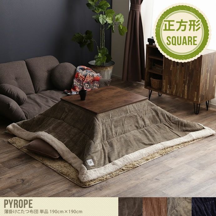 コーデュロイ×ボアで冬にピッタリ!薄掛けタイプのこたつ布団(正方形)です。見た目、肌触りからあたたかみが感じられ、あったかぬくぬくのこたつ生活を送れます。薄型なので圧迫感を与えず、お部屋をスッキリと見せられます。ワンルームや狭めのお部屋にお住まいの方にもオススメ!布団が身体にフィットする為、隙間を作らず、こたつの熱を逃さずキープし続けます。カラーは4色をご用意、さまざまなお部屋やインテリアとも合わせやすくコーディネートの幅も広がりそうですね♪
