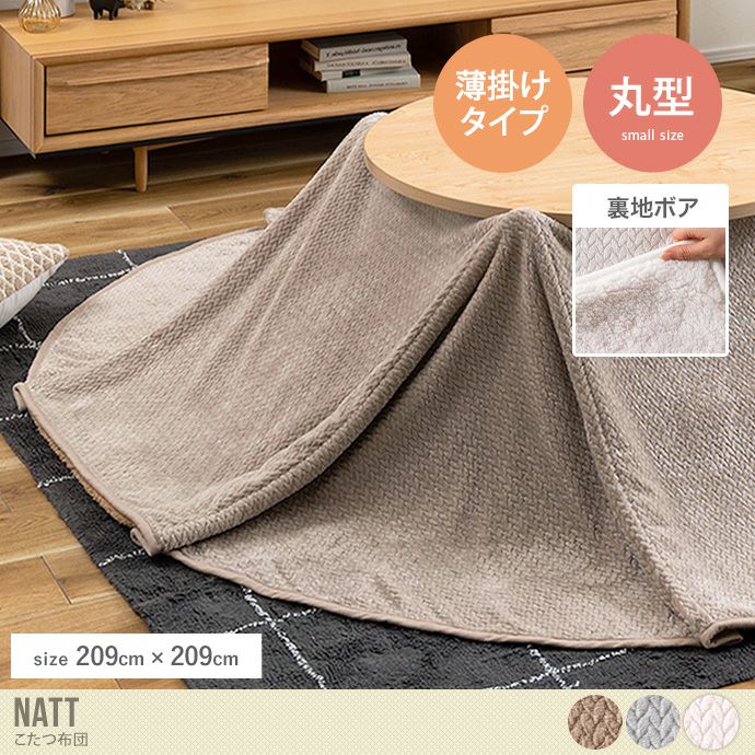 ニット調のしっとり柔らかい手触りが気持ちいい『Natt(ナット)』こたつ布団。表地には触り心地のいいニット調の起毛生地、裏地にはふわふわ気持ちがいいシープボア生地を採用。空気が逃げにくく、温かさをキープしてくれるため、寒い冬も快適にお過ごしいただけます。さらに重さは約1.7kgと軽量で持ち運びもラクラク。薄手でかさばらないため、オフシーズン中もコンパクトに収納していただけます。