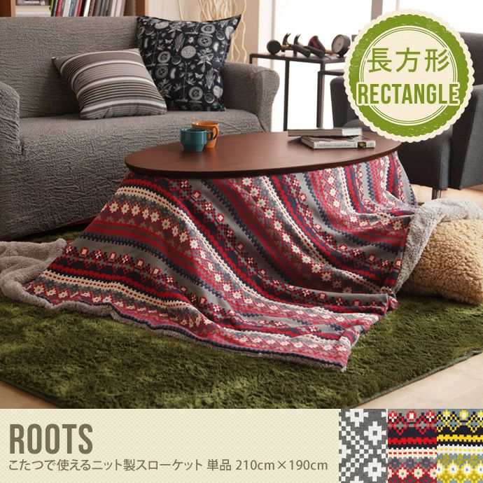 寒い季節に欠かせないマストアイテム『Roots こたつで使えるニット製スローケット 単品 210cm×190cm』。使い方いろいろ!こたつだけでなく、ベッドカバー、ソファカバー、ブランケットとしても使える寒い季節に欠かせないアイテムです!