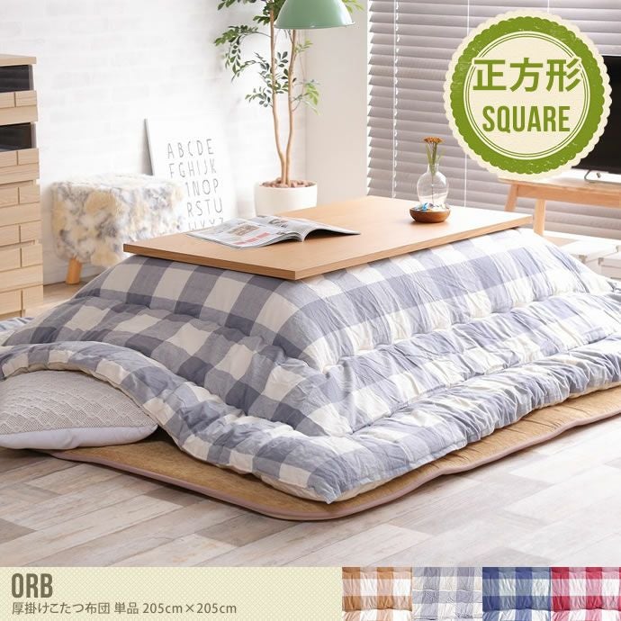 寒い季節にピッタリな正方形の厚掛けこたつ布団205cm×205cm『Orb』。ギンガムチェック柄が親しみやすく、お部屋の雰囲気も温かみのある空間に演出してくれます。機能性も抜群で、自然素材のインド綿を使用することで、気持ちのいい肌触りと通気性を実現。そして、中綿にマッシュロン綿を詰めることで、ふかふかな弾力感と保温性にも優れています。※対応するこたつ台は幅75~90cmに適応しております。
