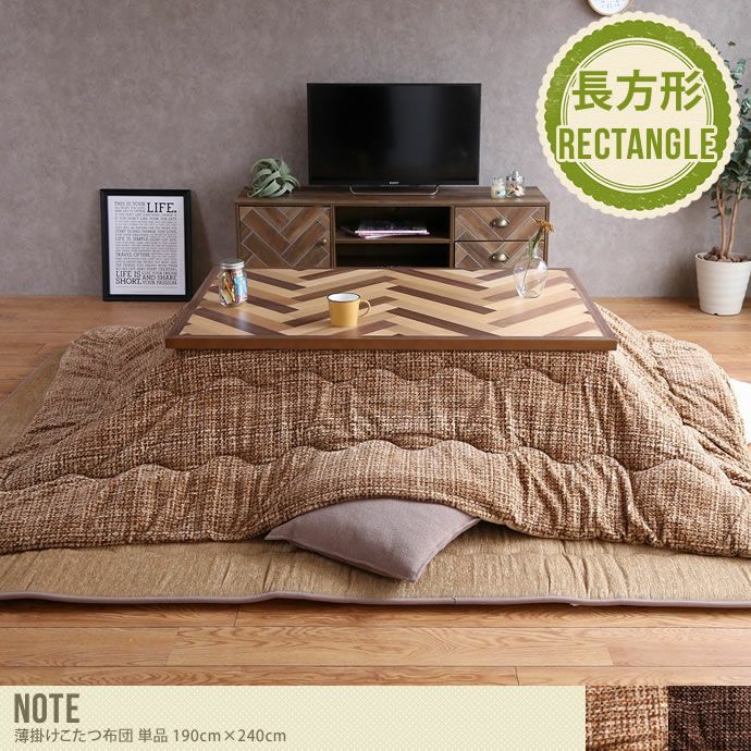ツイード調のデザインが、冬の季節にピッタリな薄掛けタイプのこたつ布団190cm×240cm(長方形)。見た目と肌触りから温かみが感じられ、ぽかぽかと温かい生活が送れます。薄手タイプなので圧迫感を与えず、お部屋をスッキリと見せることができるので空間を広く見せたい方にオススメです!また、薄掛けタイプだから布団が身体にフィットして隙間をつくらず、中の熱をキープしてくれます。落ち着きのあるベージュとブラウンの2色をご用意しています。お部屋のイメージに合わせてお選びいただけます。