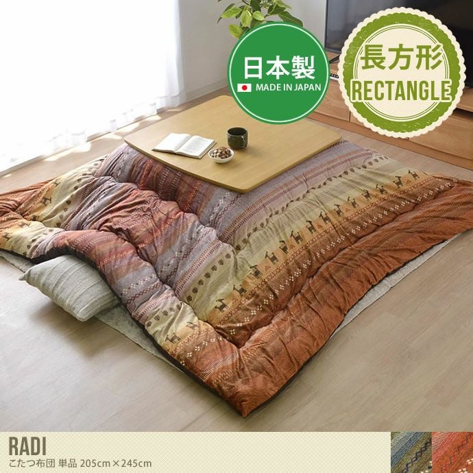 フランネル素材を使った冬にピッタリの『Radi(ラディ)』こたつ布団205×245cm。フワフワとした柔らかな手触りが心地よく、見た目からも温もりを感じさせるデザイン。メリハリのあるギャベ柄デザインでお部屋のアクセントにもぴったりです。またカラーは、お部屋のコーディネートに合わせて選べる2色からご用意しています。オレンジは太陽のような温かみがあり、グリーンはアースカラーをイメージした自然な仕上がりとなっています。温もりを感じるデザインと、使い心地の良い厚掛けこたつ布団で快適なこたつライフを過ごせます。