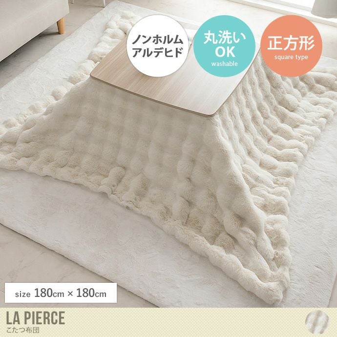 大人かわいいシンプルなデザインの『La Pierce(ラピアス)』こたつ布団。ラビットファー調のもこもことしたシルエットで、ずっと触れていたくなるような触り心地に仕上げました。贅沢なボリューム感で生地に重みがあり、あたたかいためブランケットとしてもお使いいただけます。また乳幼児基準値をクリアしているため、小さなお子様がいるご家庭でも安心して使用可能です。