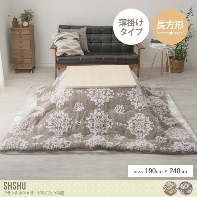 淡色遣いで派手すぎない、ささやかな可愛さの大人フェミニンの『Shshu(シュシュ)』シリーズからこたつ布団が登場しました。薄掛けタイプなので畳むとコンパクトになり収納に便利です。なめらかなフランネル生地で、短毛と長毛の生地を立体的に織り上げてポコポコとした手触りも楽しめます。波型縫製で中綿が片寄るのを防ぎます。大人かわいいフェミニンな淡いカラーを2色ご用意しましたので、お好みのカラーをお選びください。