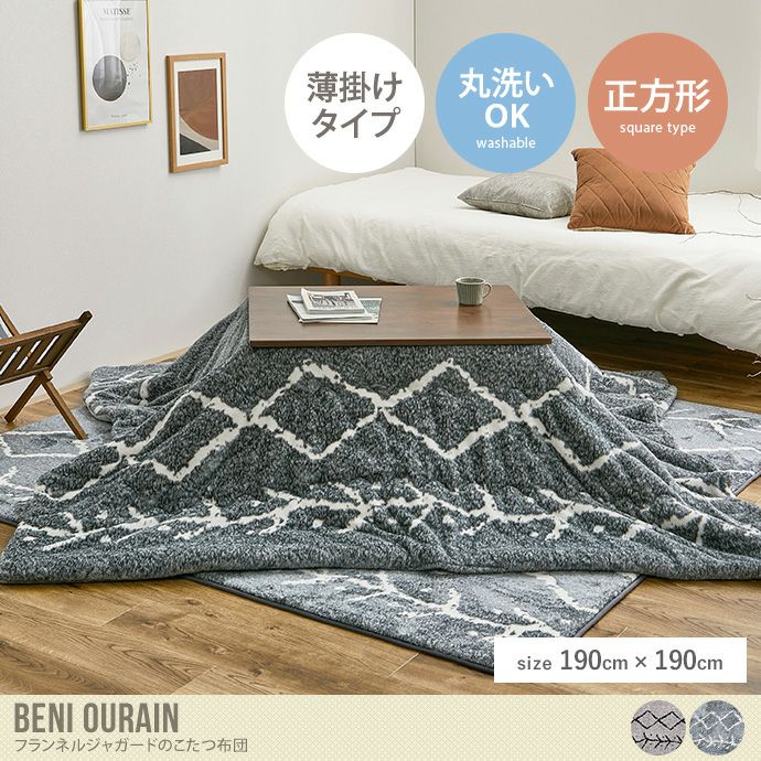 手書き風のやわらかいラインがあしらわれた『Beni ourain(ベニワレン)』シリーズから薄掛タイプのこたつ布団が登場しました。デザインはプリントではなく、先染め加工を施しているので、色味に深みがでて高級感があります。モノトーンで主張しすぎず、どんなインテリアにも馴染みやすいデザインです。