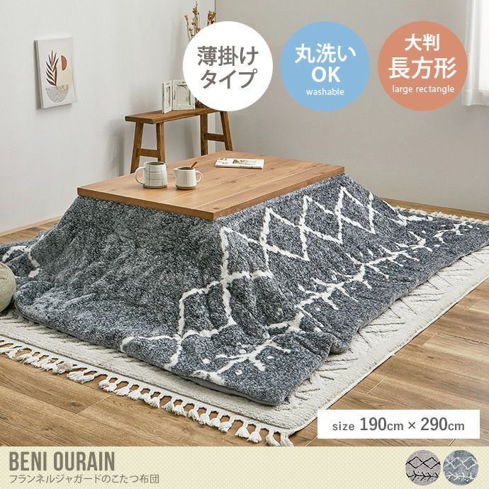 手書き風のやわらかいラインがあしらわれた『Beni ourain(ベニワレン)』シリーズから薄掛タイプのこたつ布団が登場しました。デザインはプリントではなく、先染め加工を施しているので、色味に深みがでて高級感があります。モノトーンで主張しすぎず、どんなインテリアにも馴染みやすいデザインです。