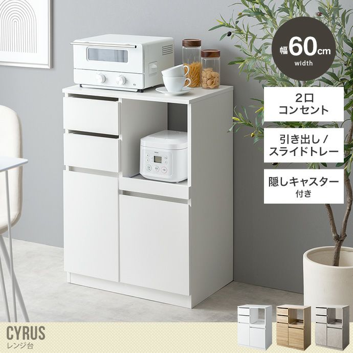 他の画像を見る 【送料無料】Cyrus サイラス 幅60 レンジ台 レンジボード レンジラック 食器棚 キッチンカウンター キッチンラック キャスター付き 60幅 キッチン収納 おしゃれ おすすめ 安い スライドトレー コンセント付き 引き出し 扉付き 扉収納 ホワイト 販売価格 ¥ 16,999 税込 送料込 カートに入れる お気に入りに登録する
